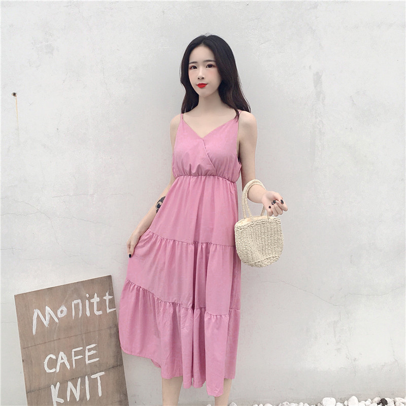 秋裝2018新款 夏季大碼女裝高腰顯瘦V領白色收腰吊帶連衣裙子女