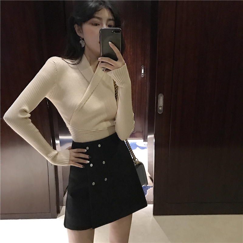 復古雙排扣高腰A字半身裙時尚套裝修身顯瘦翻領毛衣針織衫兩件套