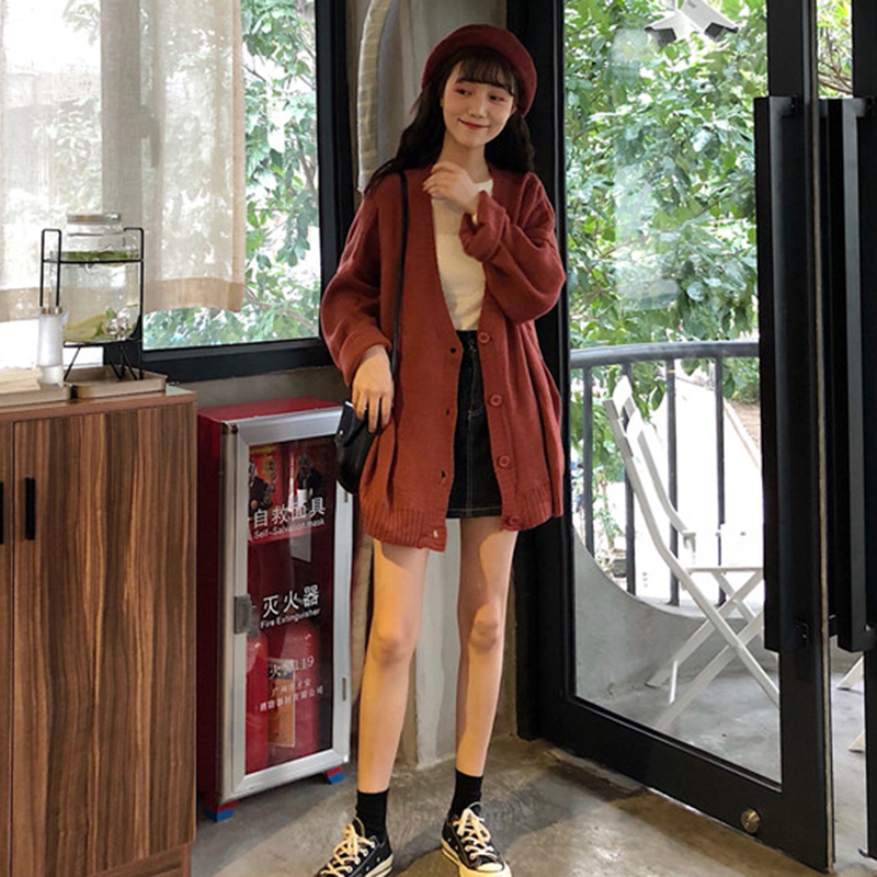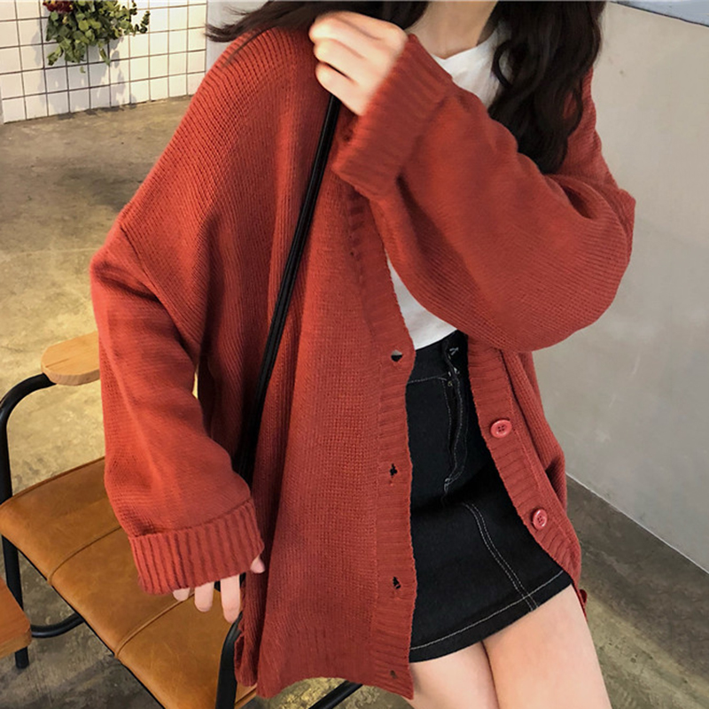 秋裝女2018新款韓版慵懶中長款毛衣外套學生休閑純色針織開衫上衣
