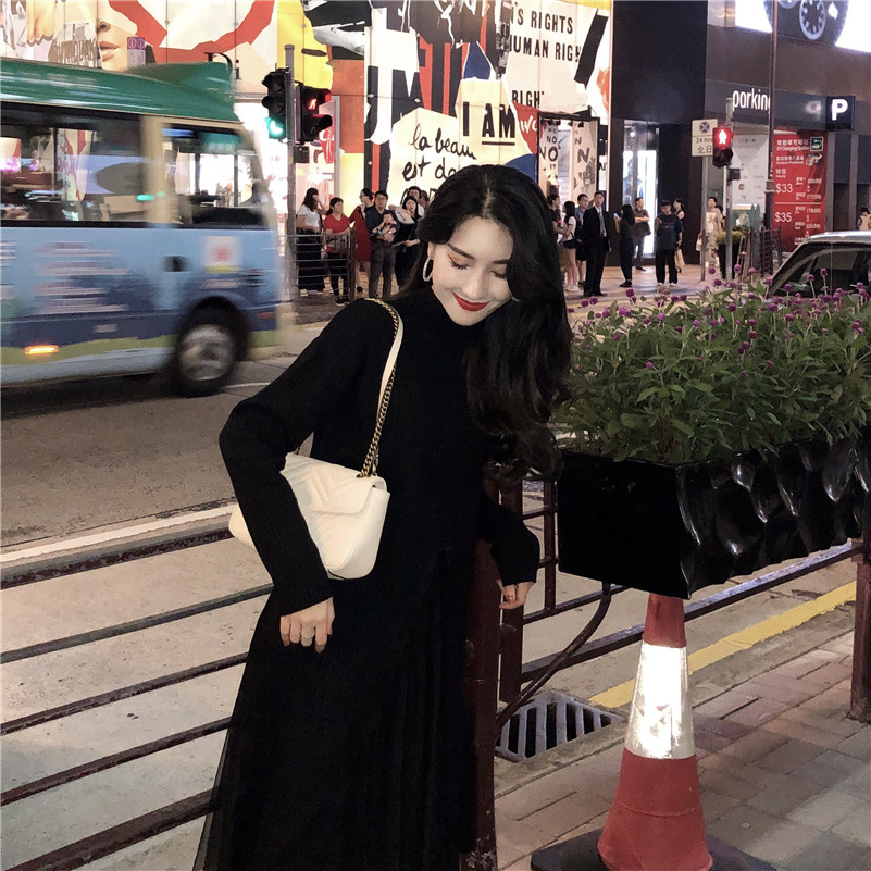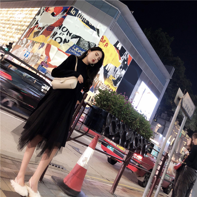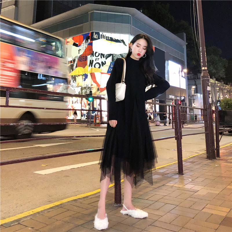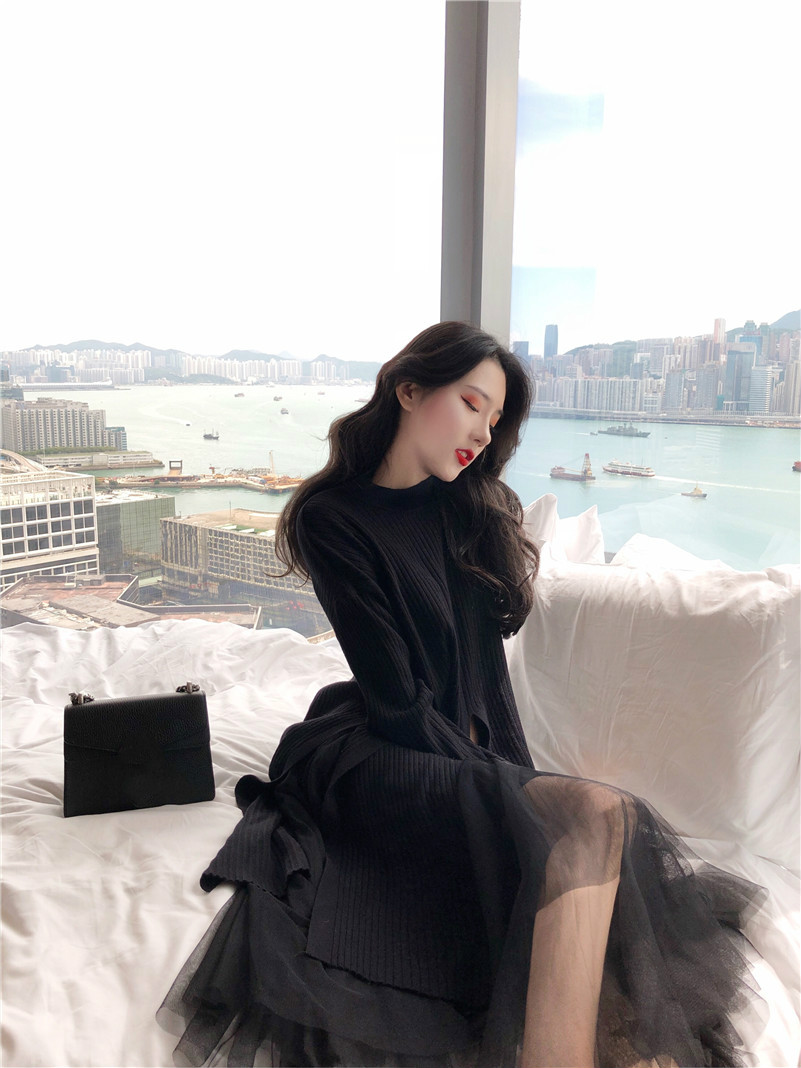 / 新款開叉套頭長款長袖毛衣外套網紗不規則半身仙女紗裙時尚套裝潮