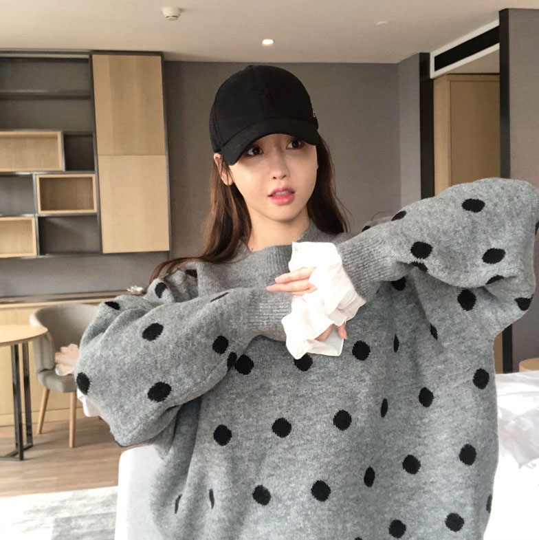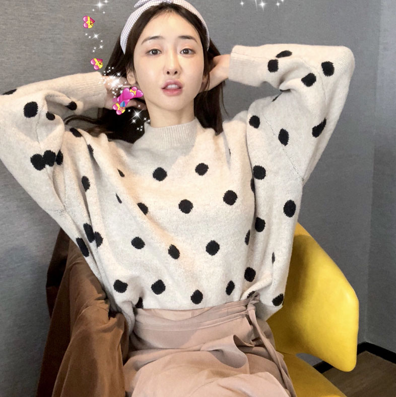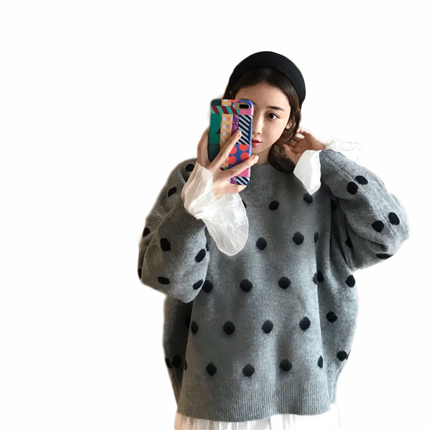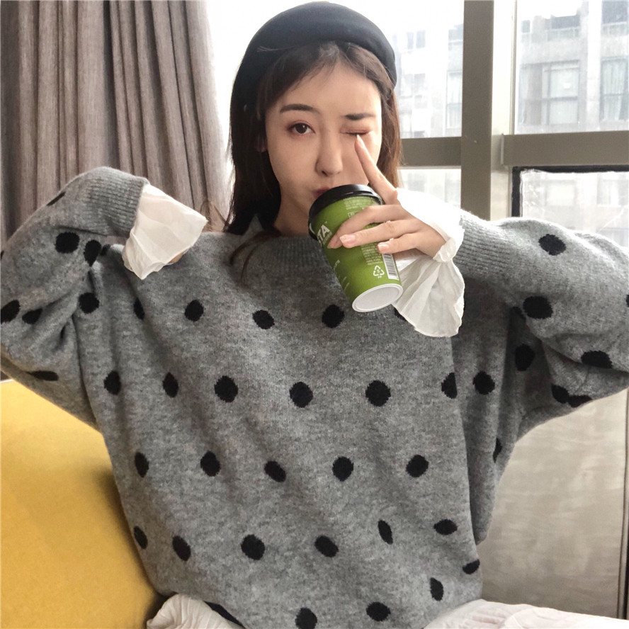 ulzzang韓版寬松顯瘦波點針織衫圓領長袖慵懶毛衣女秋冬2018新款