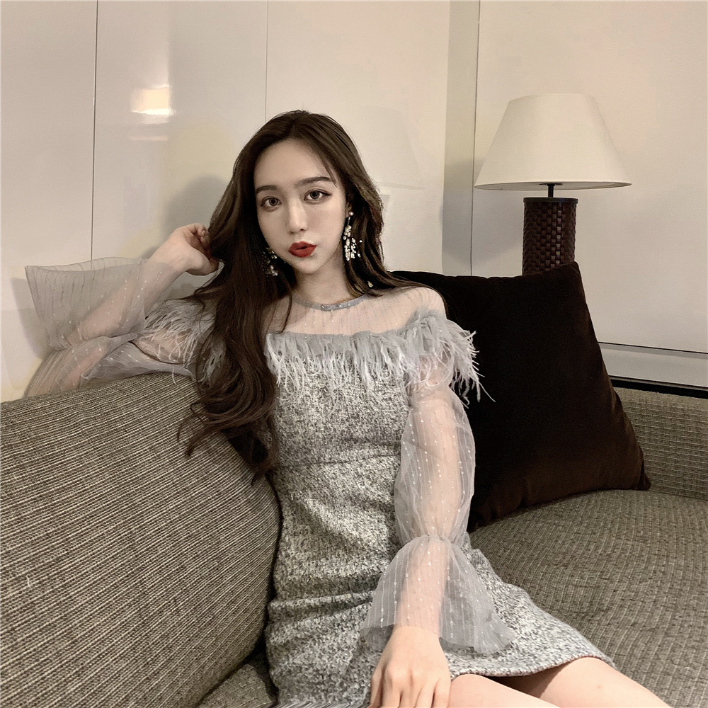 / 初冬溫柔風女冬裝2018新款時尚高腰羽毛氣質流蘇百搭A字連衣裙女