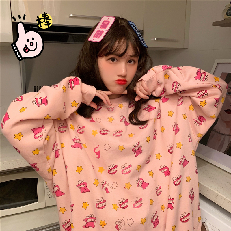/ 秋冬女裝韓版寬松原宿風個性卡通涂鴉慵懶風加絨加厚衛衣上衣外套