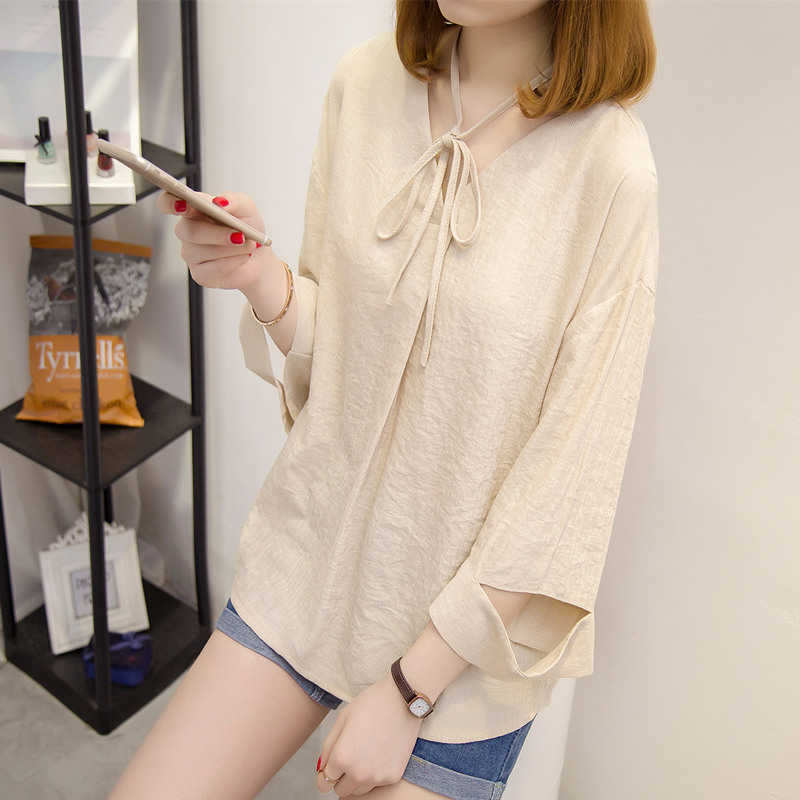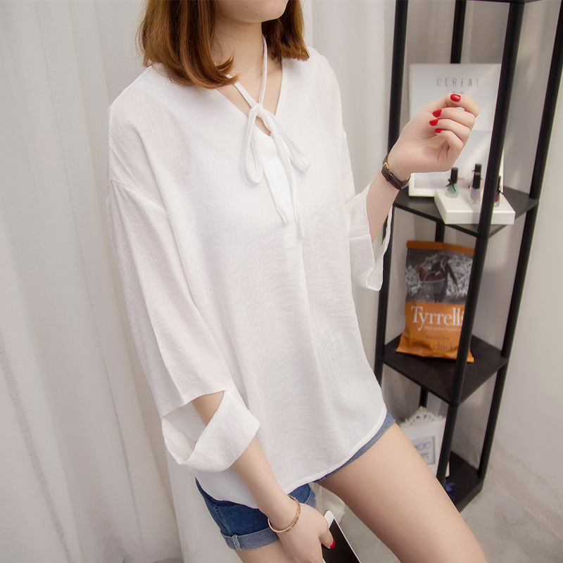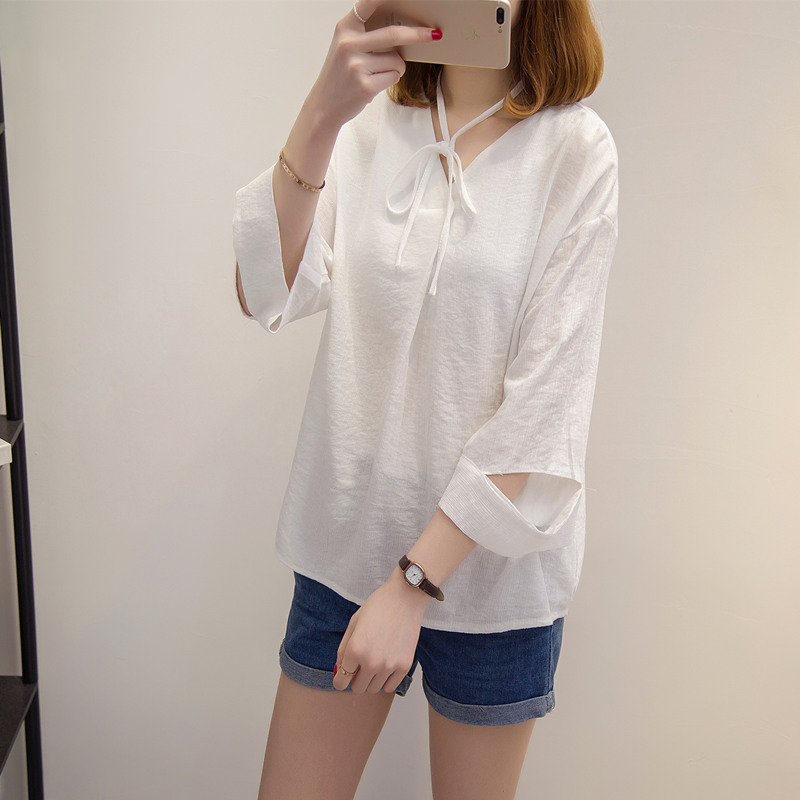 / 夏裝新款女韓版寬松系帶白色t恤女打底女長袖體恤衫上衣女潮