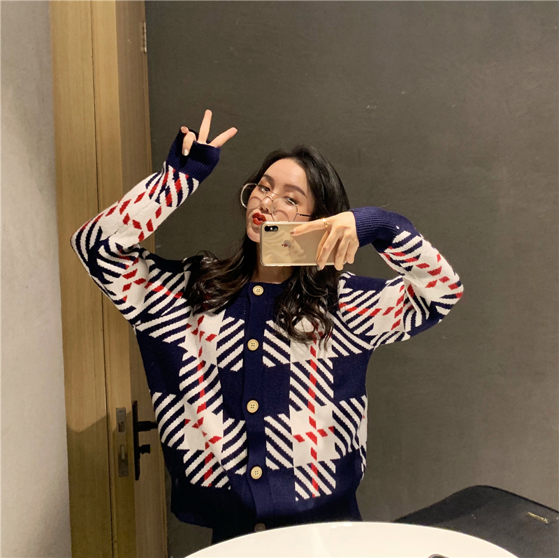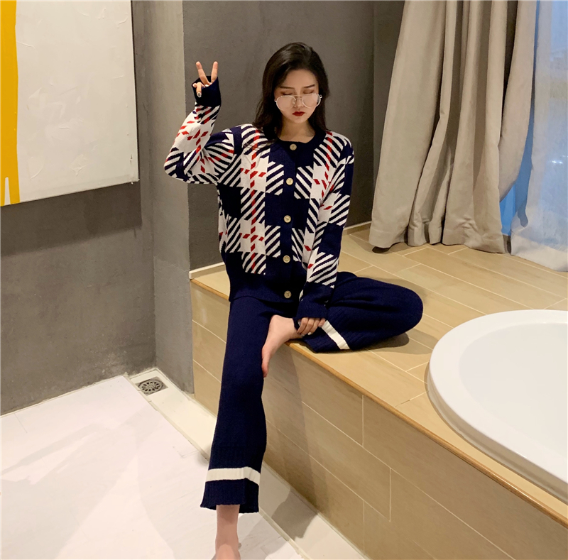 / 韓版新款時尚套裝chic復古撞色格紋毛衣外套寬松針織闊腿褲兩件套