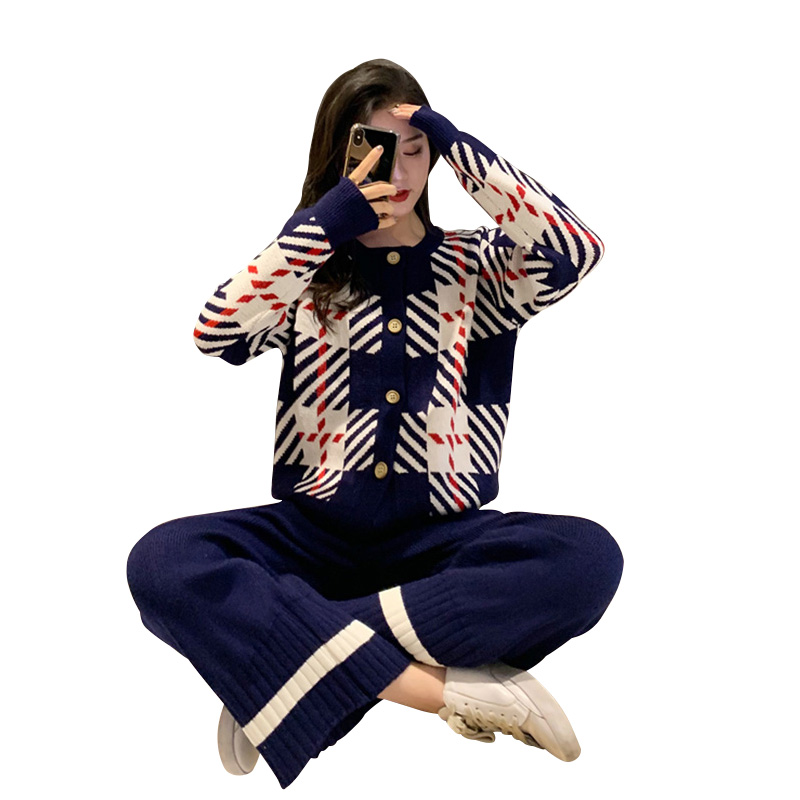 韓版新款時尚套裝chic復古撞色格紋毛衣外套寬松針織闊腿褲兩件套