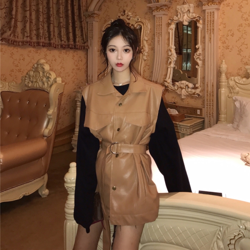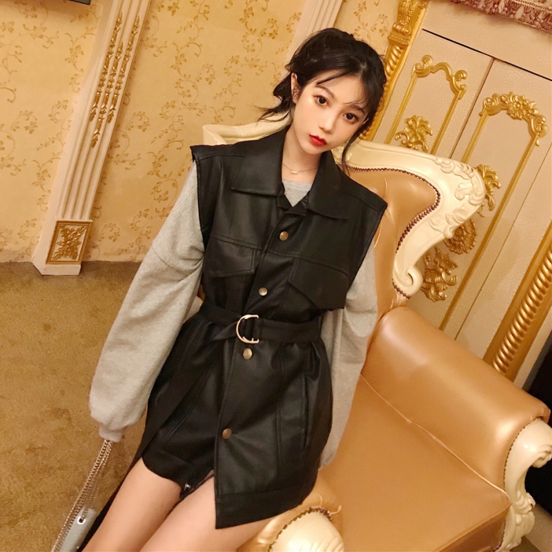 秋裝女2018新款顯瘦翻領無袖機車PU皮衣夾克外套腰帶馬甲+衛衣潮