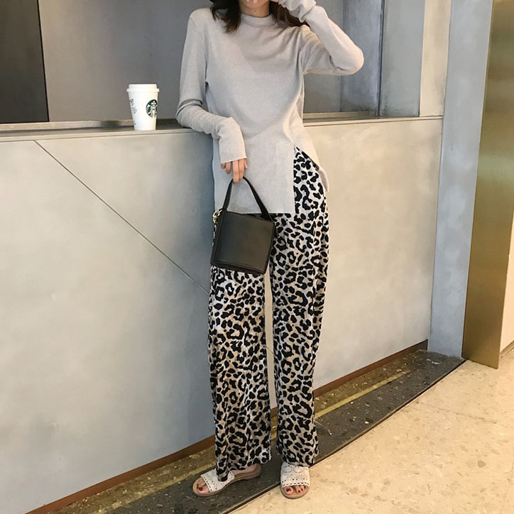 / 秋季套裝女時尚兩件套顯瘦閃閃開叉打底長袖T恤+絨面豹紋休閑長褲