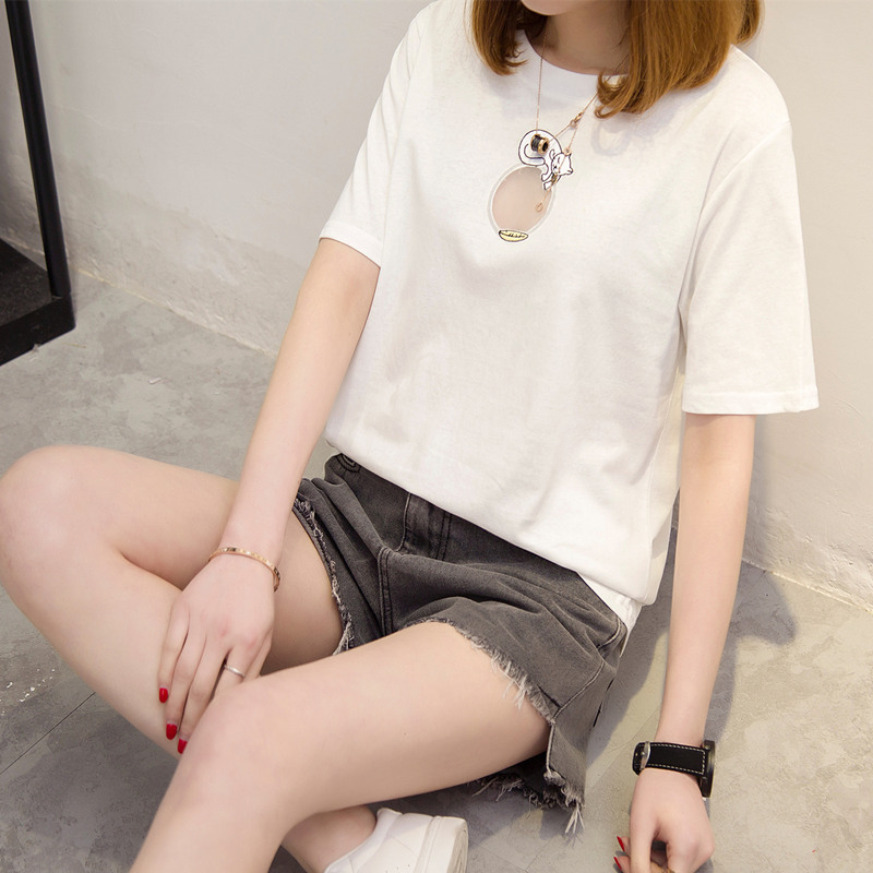 / 女裝夏裝新款潮上衣女夏短袖t恤女鏤空簡約時尚寬松體恤衫
