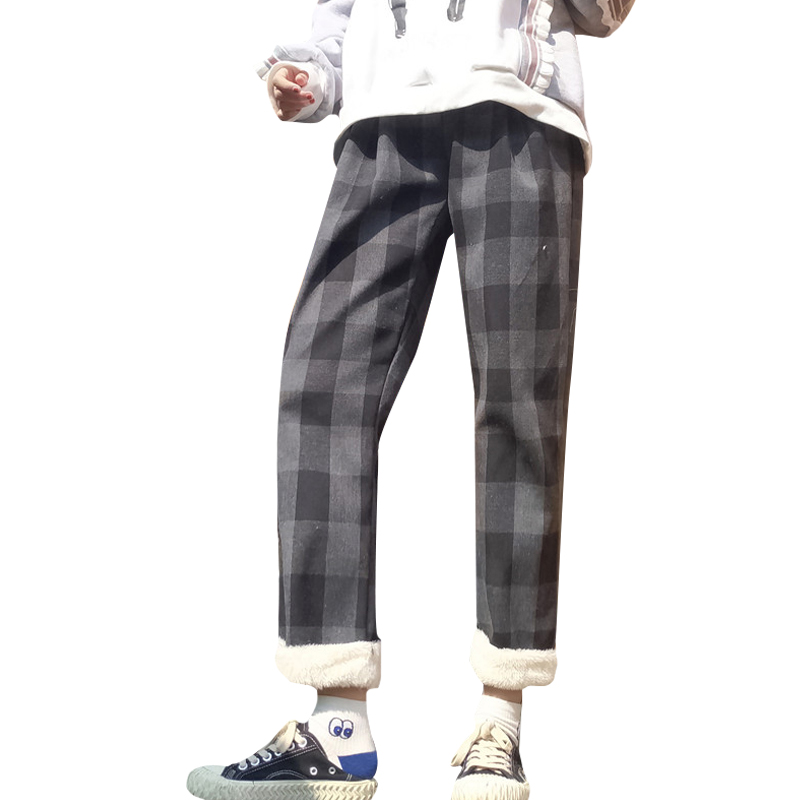 / 秋冬女裝韓版寬松格子加絨休閑褲工裝褲子高腰直筒褲闊腿褲九分褲