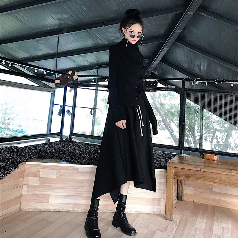 新款韓版秋季時尚套裝堆堆領單排扣長袖針織上衣不規則抽繩半身裙