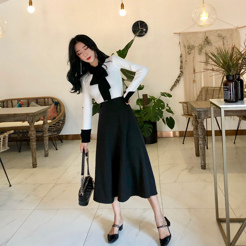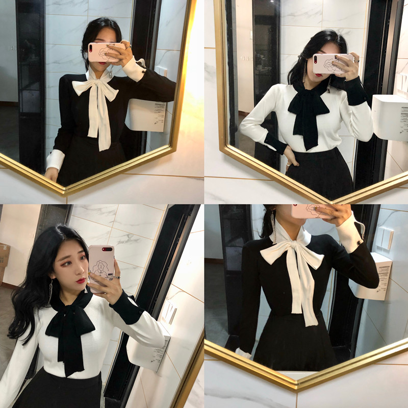 / 秋裝新款修身復古chic韓版氣質百搭撞色圍巾領針織衫女打底上衣潮