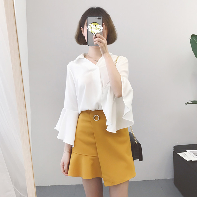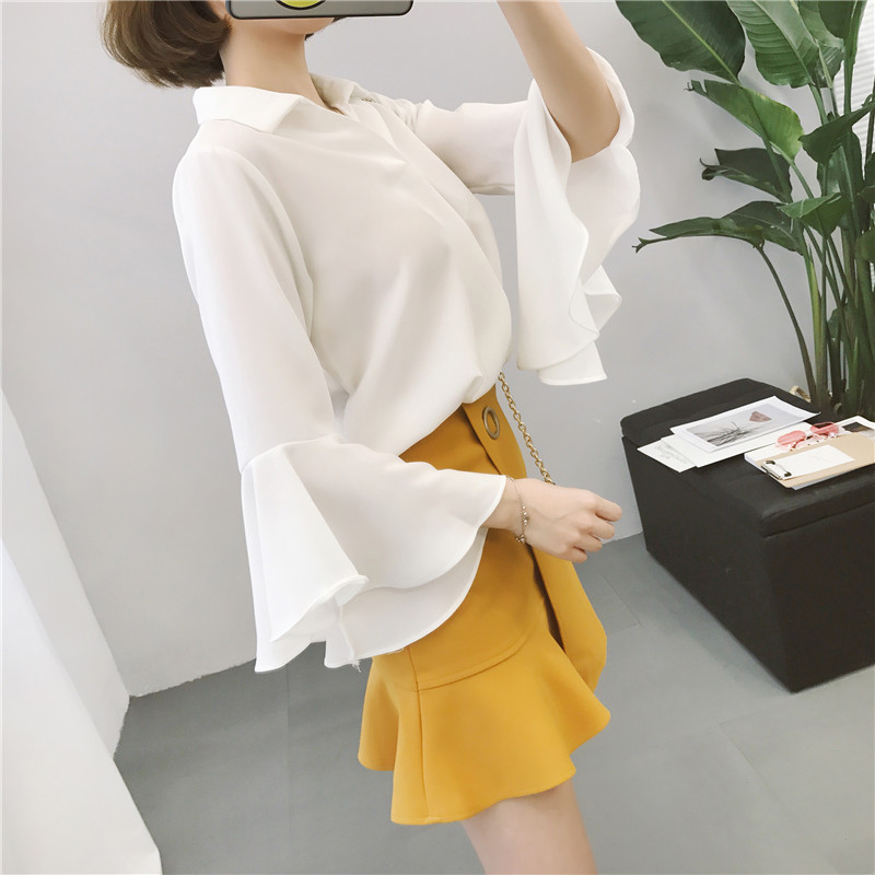 / 秋裝女2018新款韓版簡約喇叭袖雪紡襯衫學生時尚洋氣寬松V領上衣