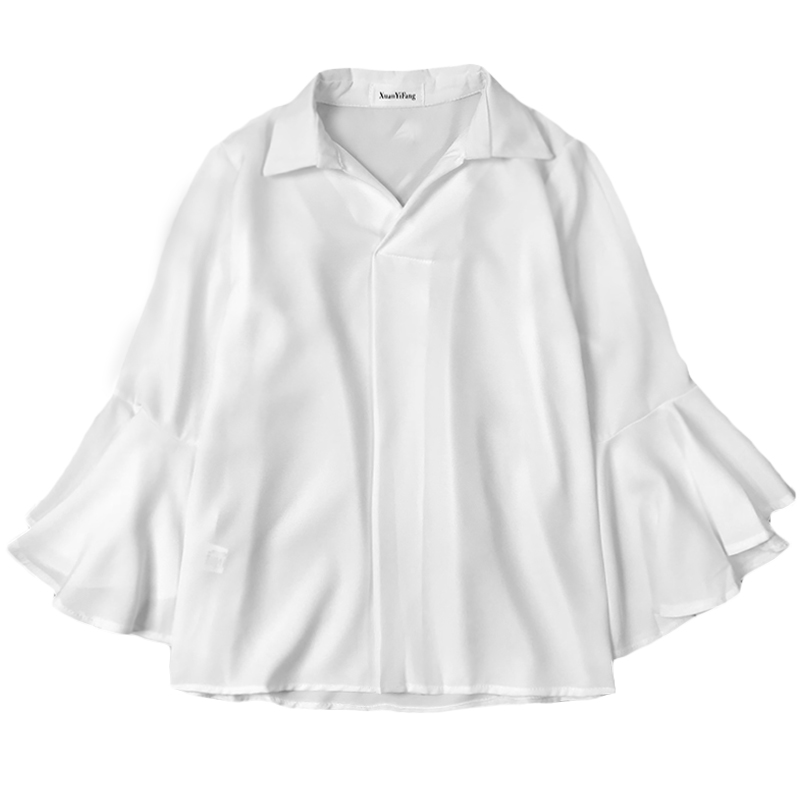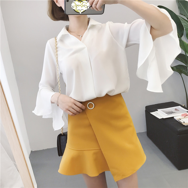 秋裝女2018新款韓版簡約喇叭袖雪紡襯衫學生時尚洋氣寬松V領上衣