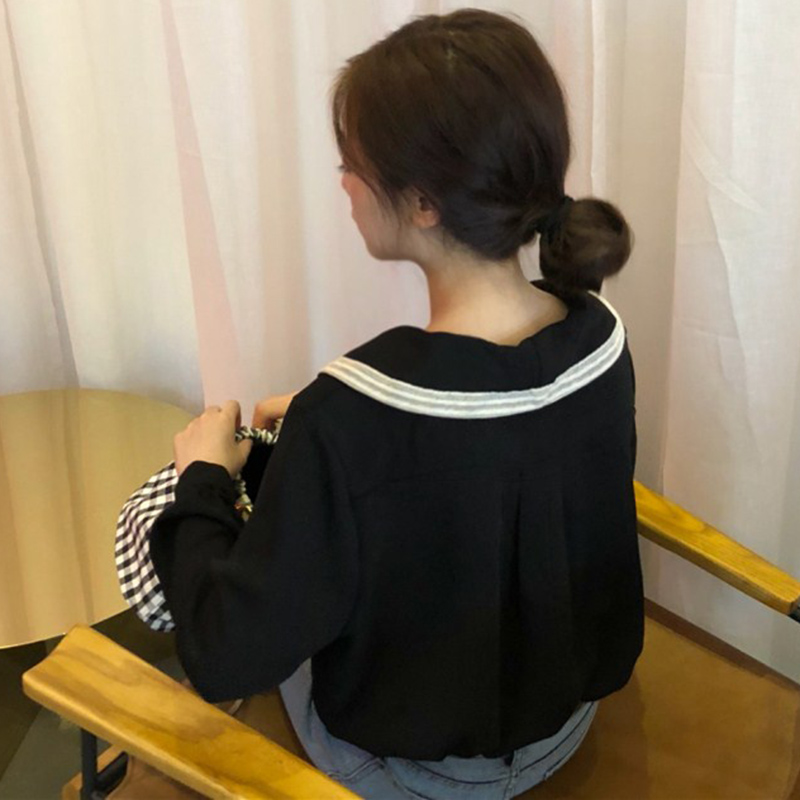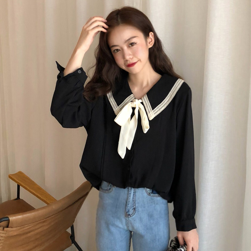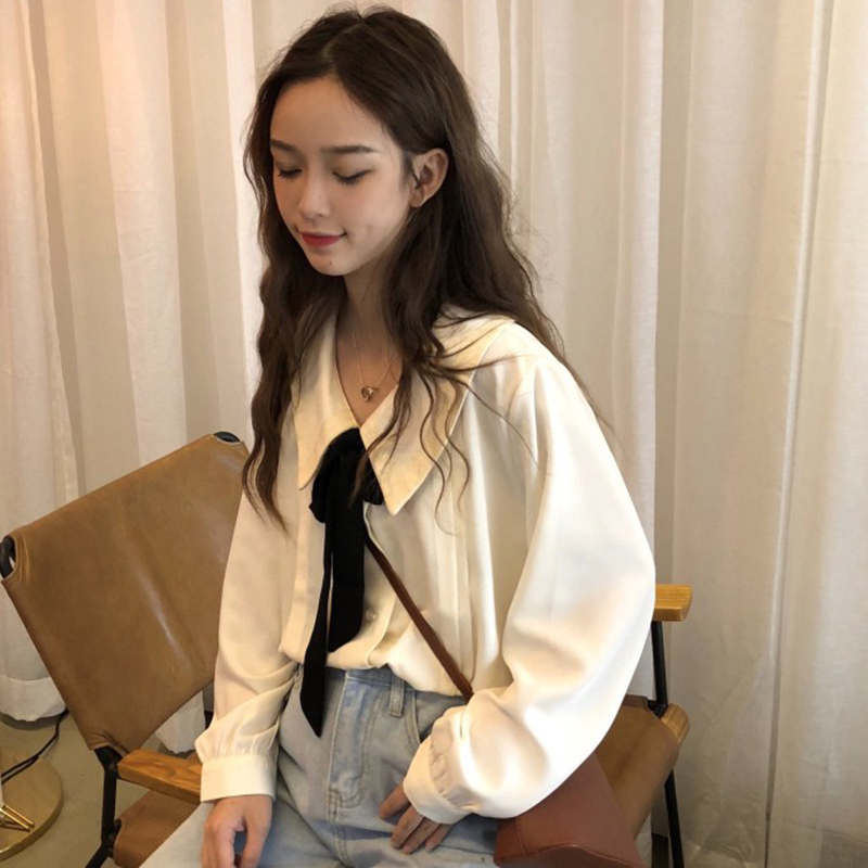 / 秋裝新款女裝撞色蝴蝶結綁帶娃娃領襯衫學院風寬松長袖襯衣上衣潮