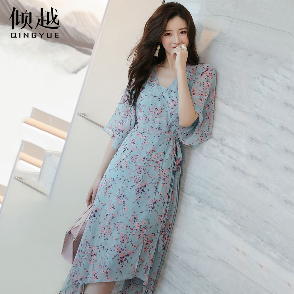 2017夏季新款雪紡連衣裙V領碎花沙灘裙印花性感女長裙吊帶兩件套