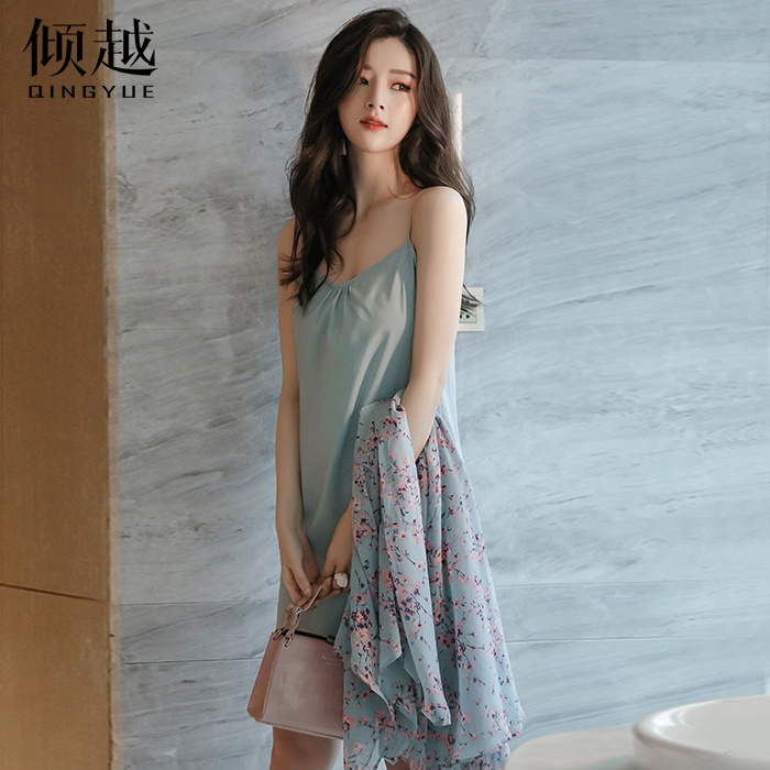 / 2017夏季新款雪紡連衣裙V領碎花沙灘裙印花性感女長裙吊帶兩件套