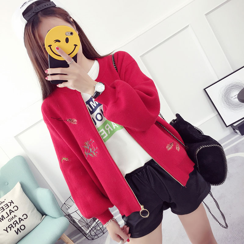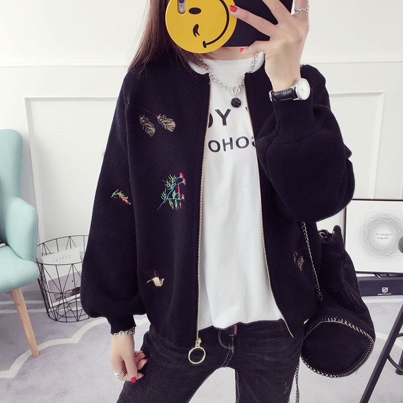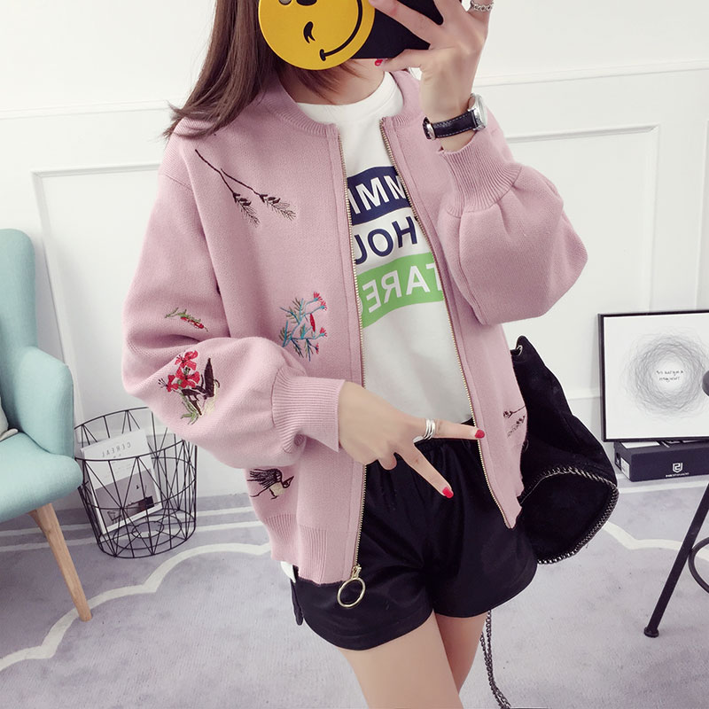/ 春季針織衫女開衫春裝短款寬松韓版學生刺繡毛衣外套燈籠袖上衣潮