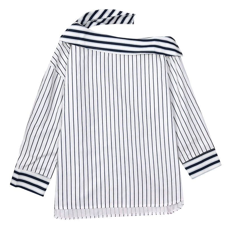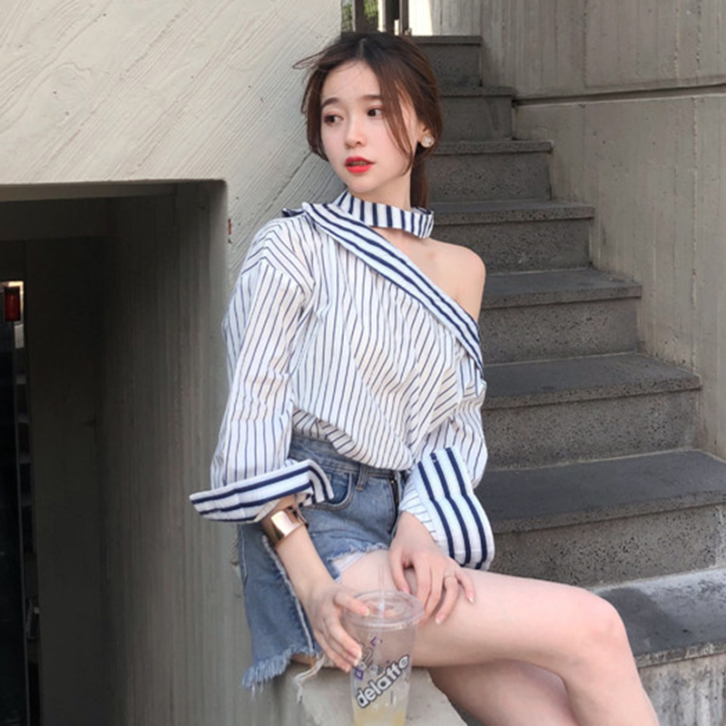 秋裝女2018新款韓版港風寬松長袖條紋襯衫心機個性露肩掛脖上衣潮