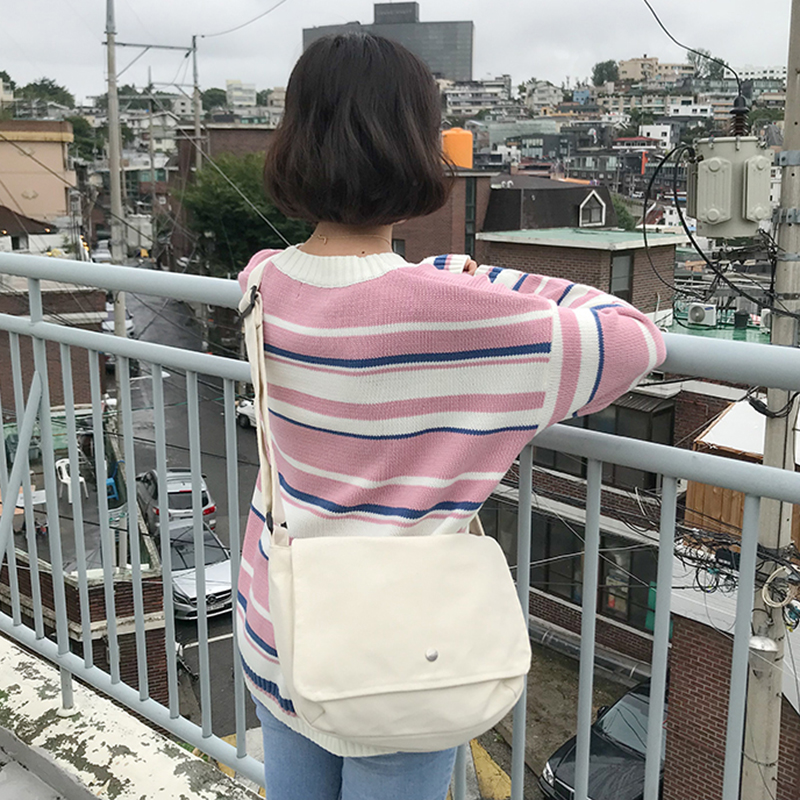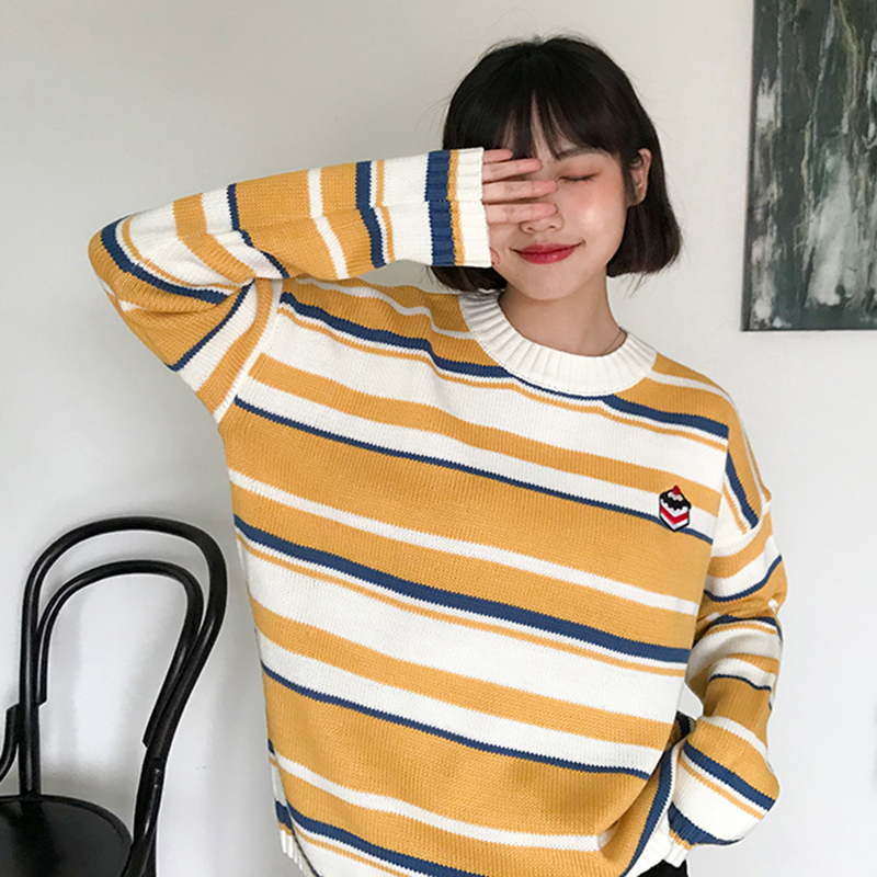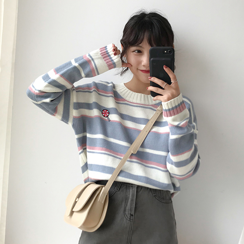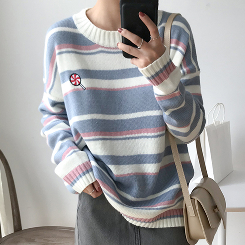 / 甜美少女卡通刺繡毛衣秋裝新款拼色條紋長袖針織衫學院風休閑上衣