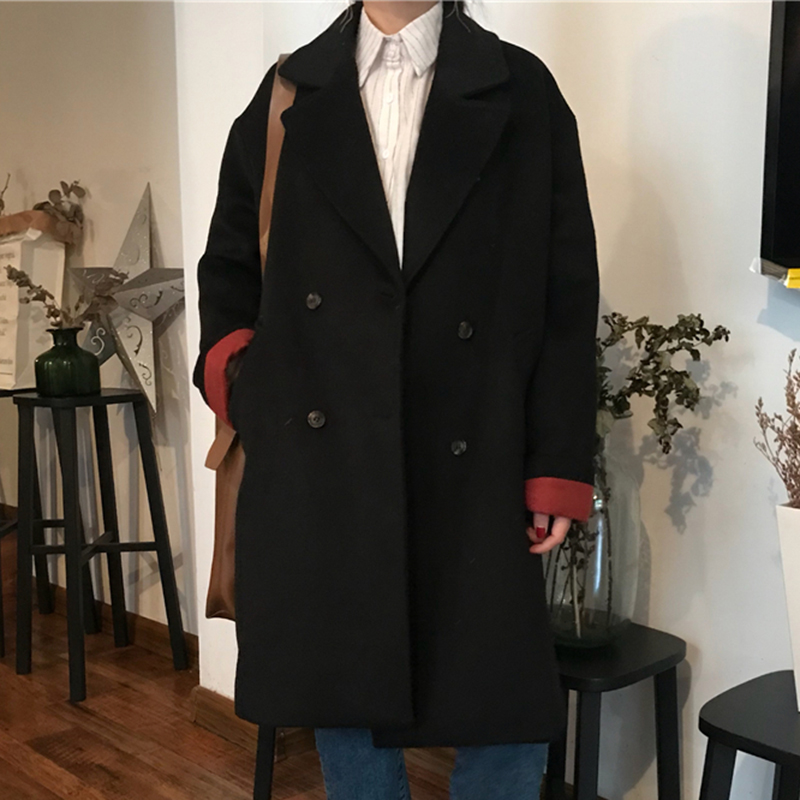 2018中長款毛呢外套秋冬女裝新款寬松長袖呢大衣西裝領呢子雙排扣