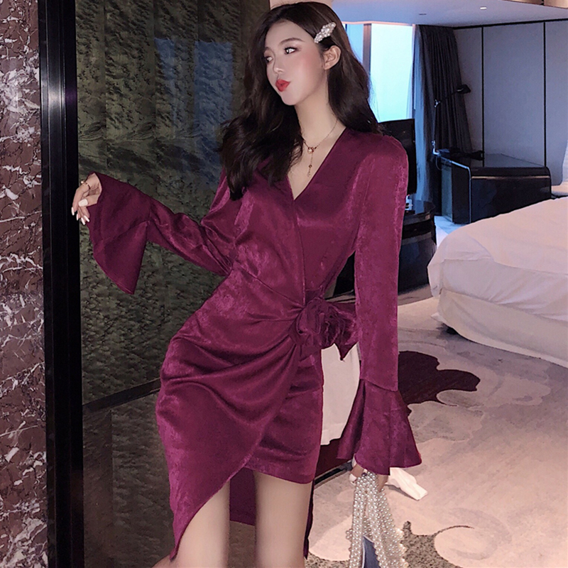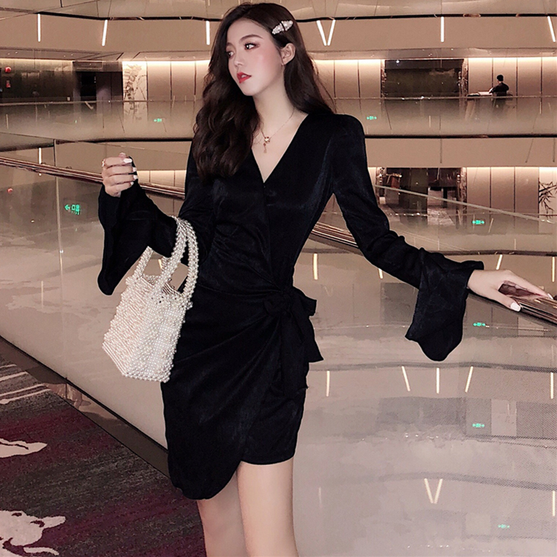 / 氣質V領收腰顯瘦不規則連衣裙子女秋冬裝新款法式黑色復古桔梗裙