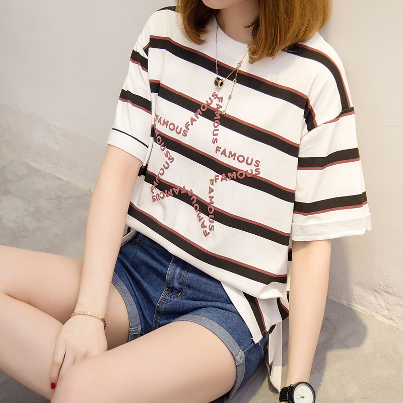 條紋t恤女短袖韓版潮夏裝新款女裝開叉時尚體恤百搭上衣女夏