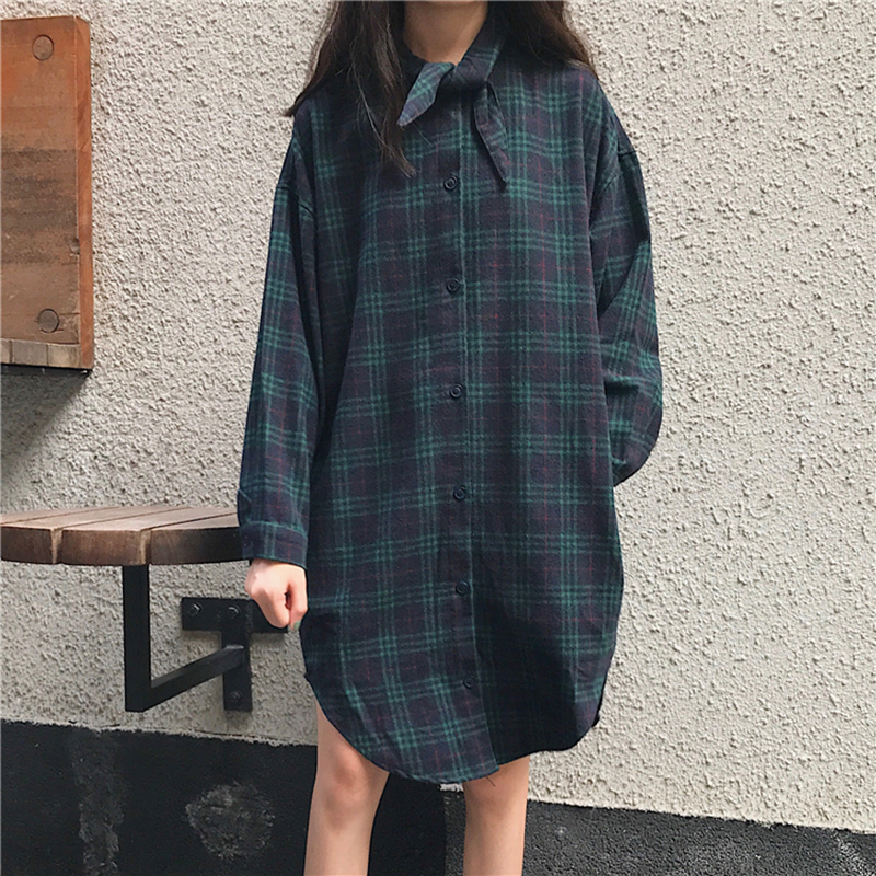 秋冬女裝2018新款中長款襯衫式連衣裙韓版領口系帶長袖格子egg裙