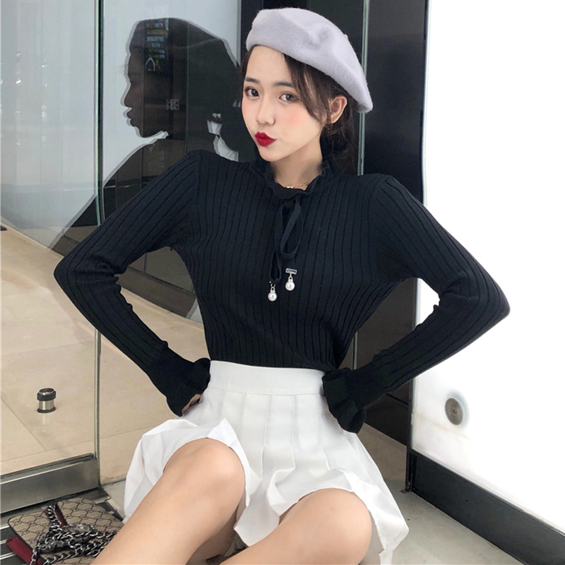 / 秋冬裝2018新款系帶半高領打底針織衫女修身顯瘦長袖白色時尚上衣