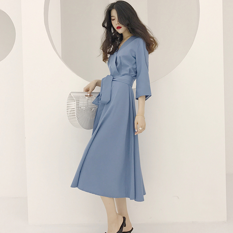 早秋復古女裝2018新款氣質收腰中長款連衣裙中袖V領A字裙大擺裙子