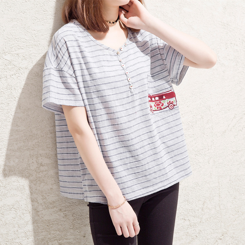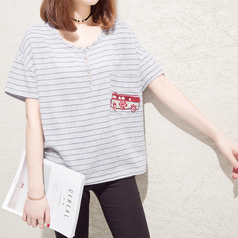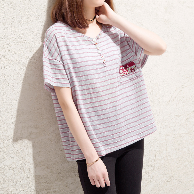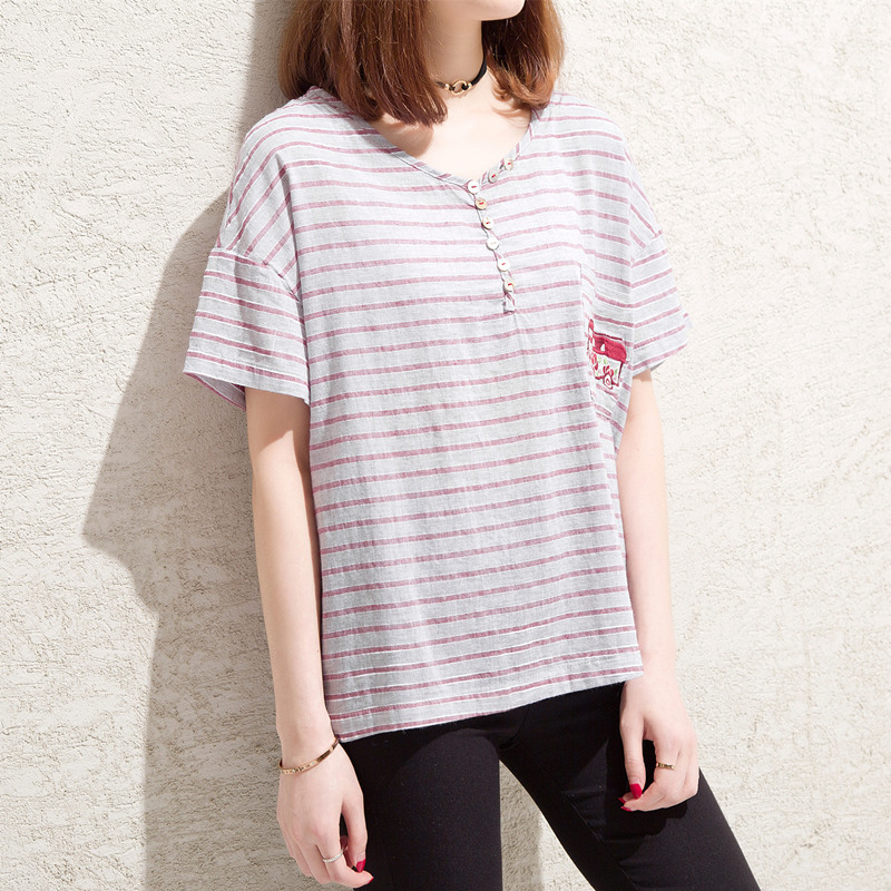 / 條紋t恤女韓版復古bf風小心機上衣服刺繡寬松短袖女夏裝新款
