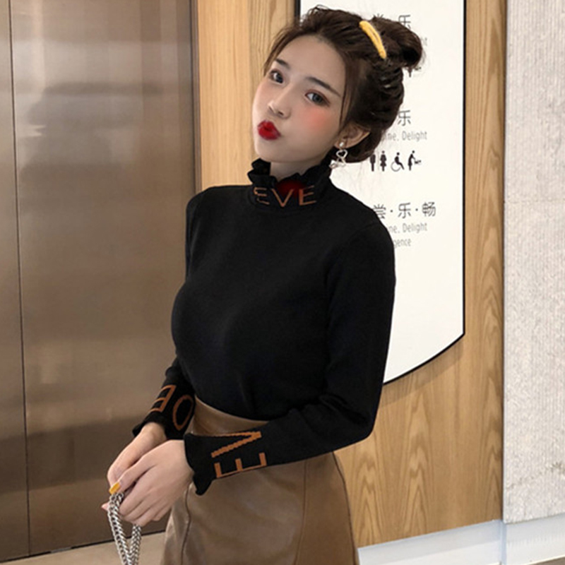 時尚字母刺繡打底針織衫女秋裝新款套頭毛衣木耳邊高領長袖上衣潮