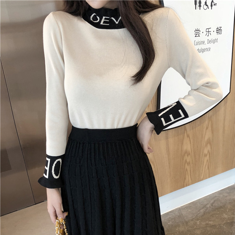 / 時尚字母刺繡打底針織衫女秋裝新款套頭毛衣木耳邊高領長袖上衣潮