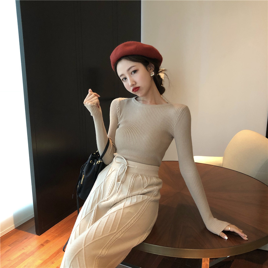 復古港味2018秋新款修身顯瘦百搭純色韓版針織長袖圓領打底衫上衣