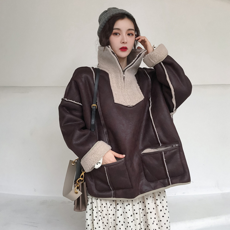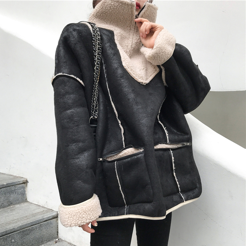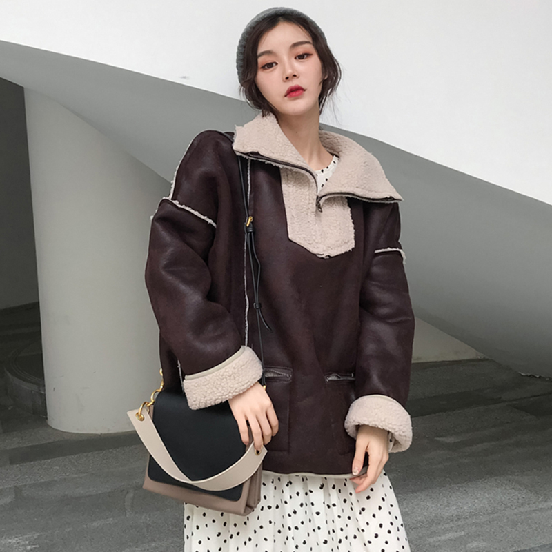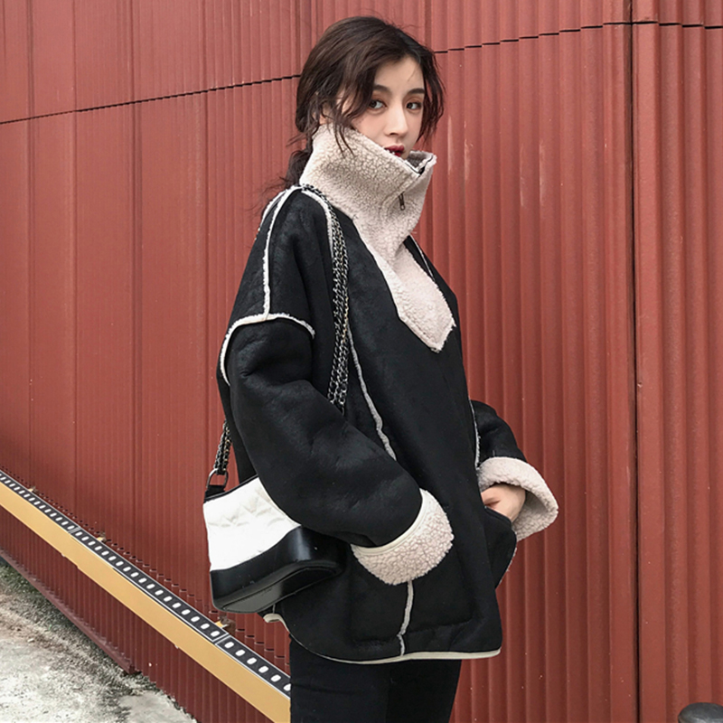 復古加厚拼接羊羔毛外套秋冬女裝2018新款港風大衣學生休閑上衣潮