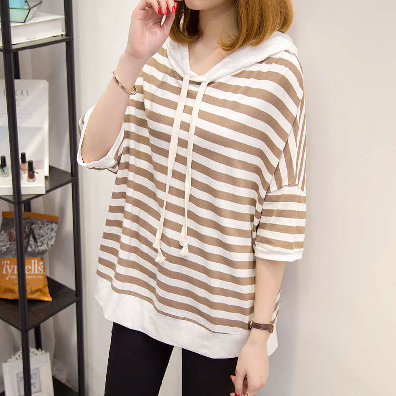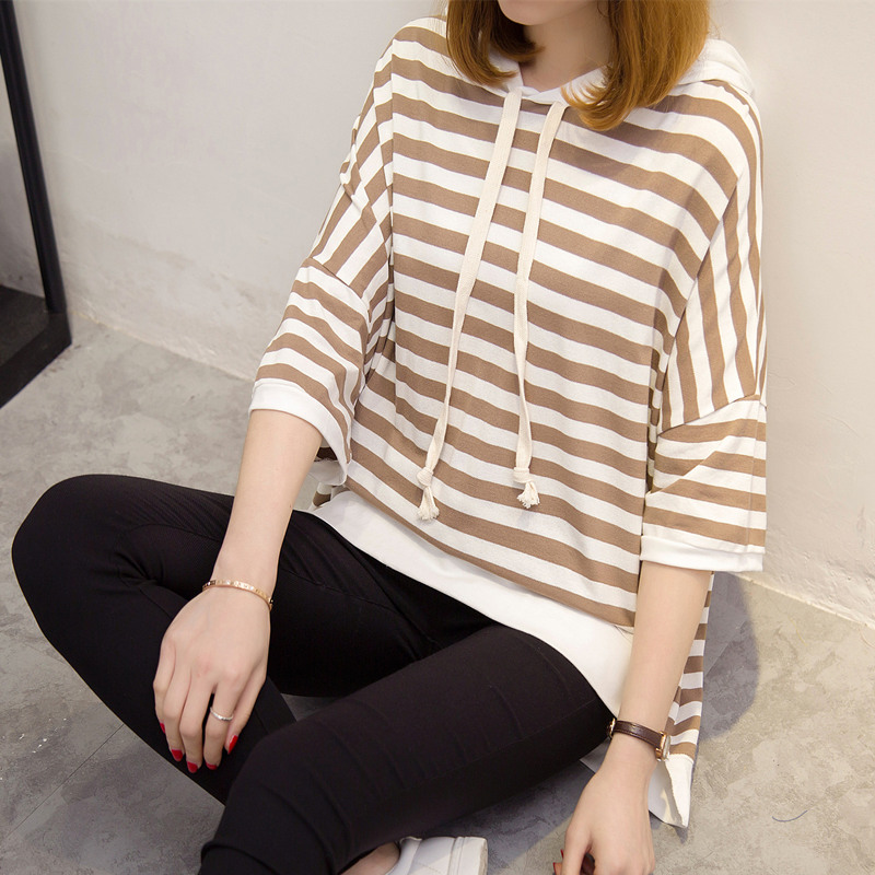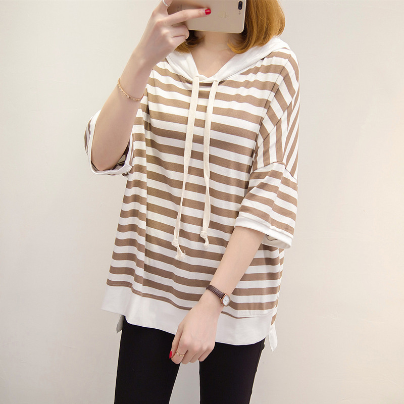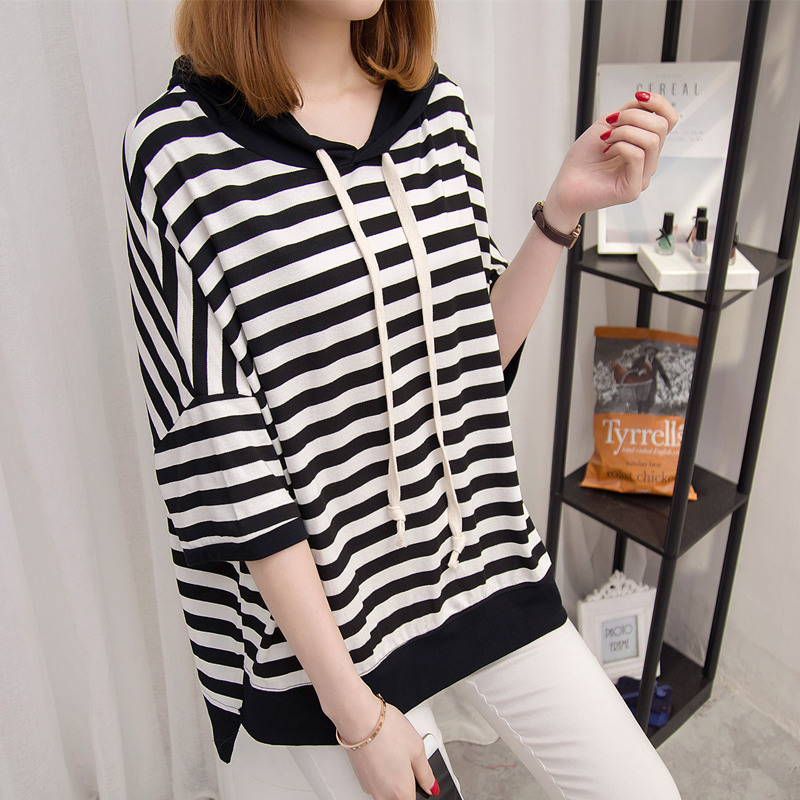 條紋短袖t恤女寬松連帽上衣體恤衫中長袖韓版女裝夏裝新款潮