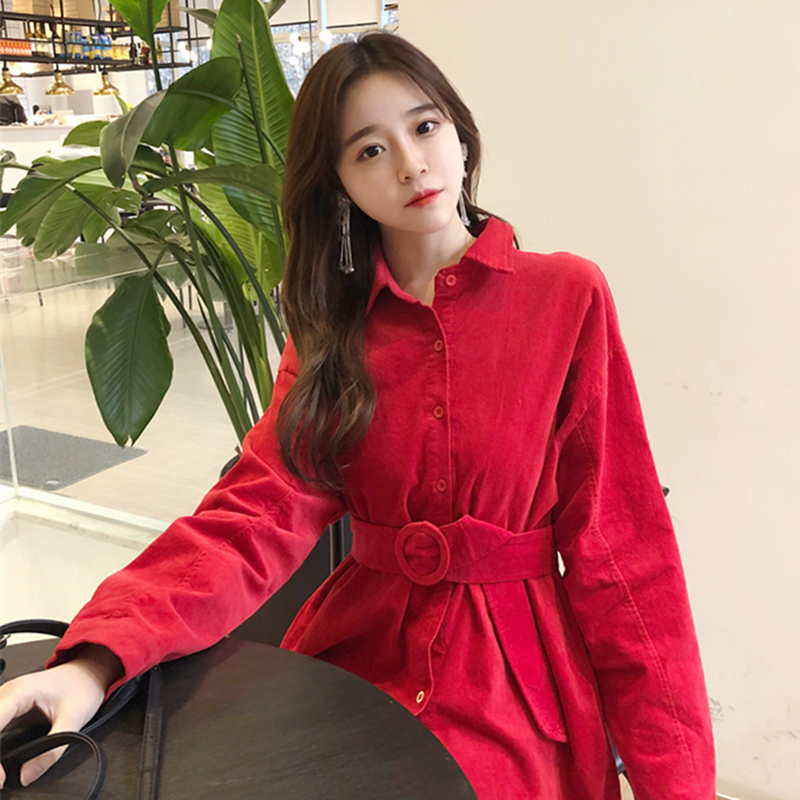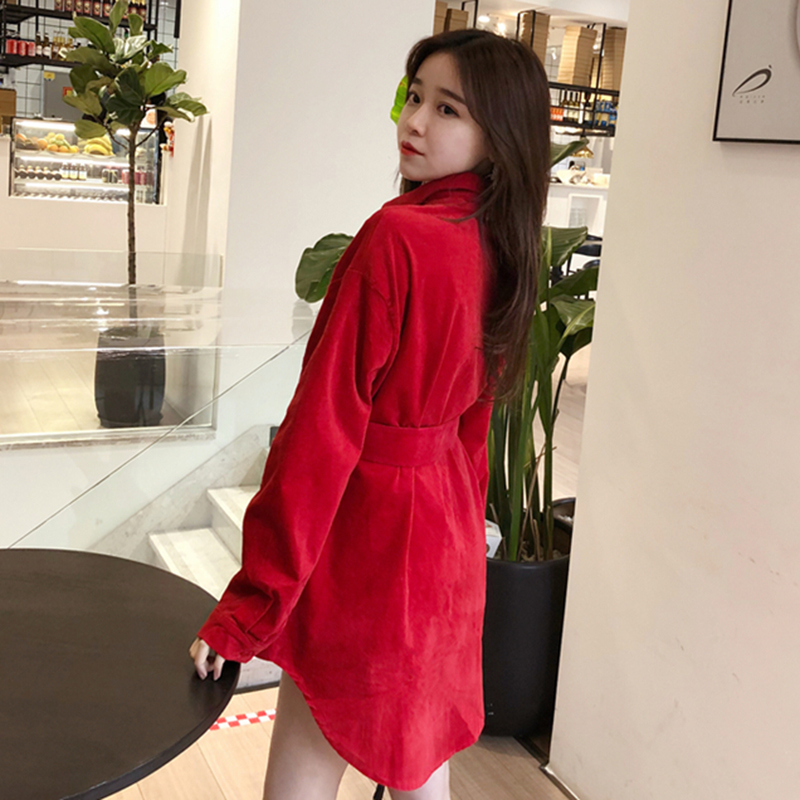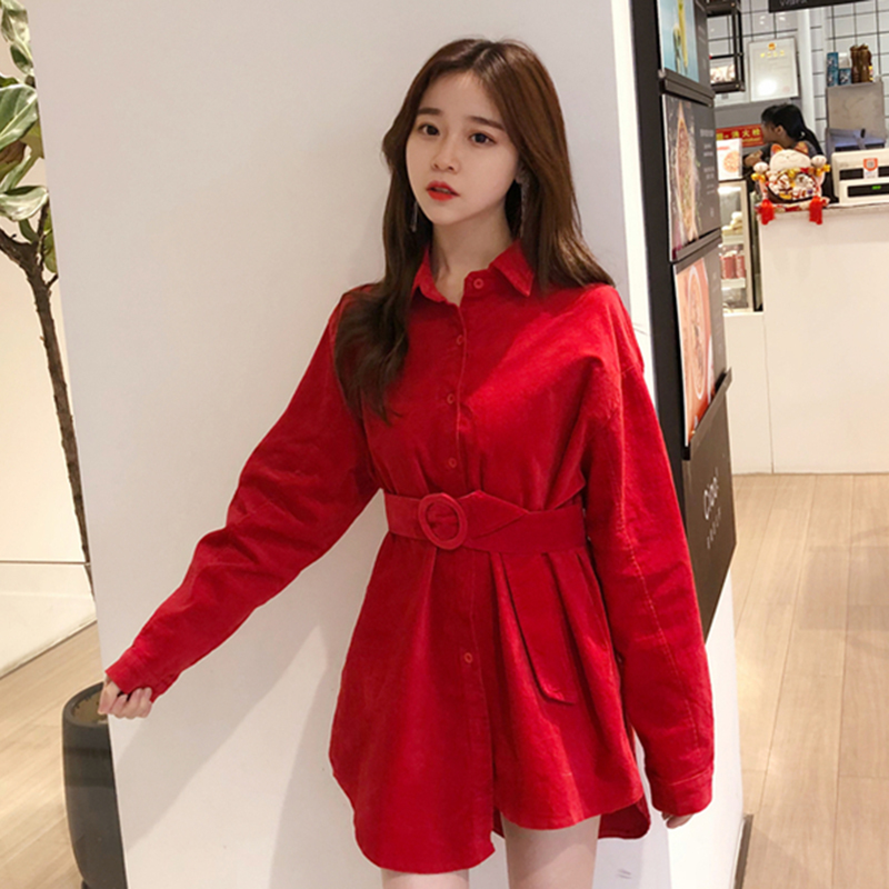 / 秋裝女2018新款個性不規則中長款紅色襯衫氣質收腰綁帶長袖上衣潮