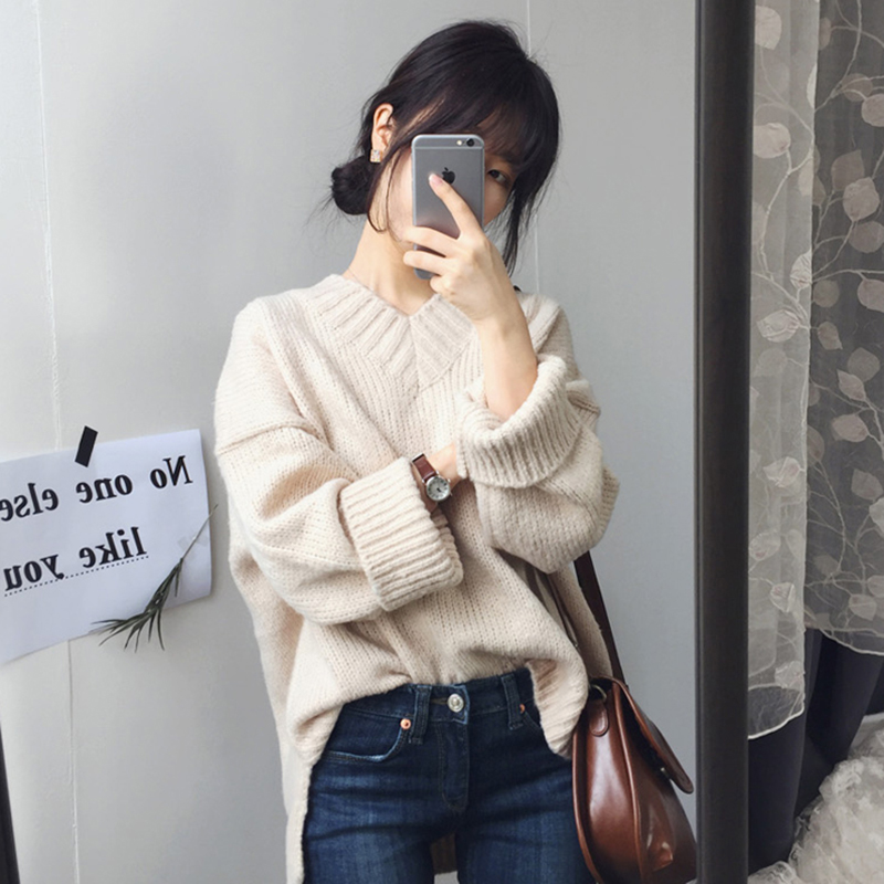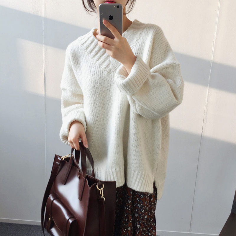 / 韓版2018秋冬季新款女裝寬松V領加厚外套慵懶風休閑開叉套頭毛衣
