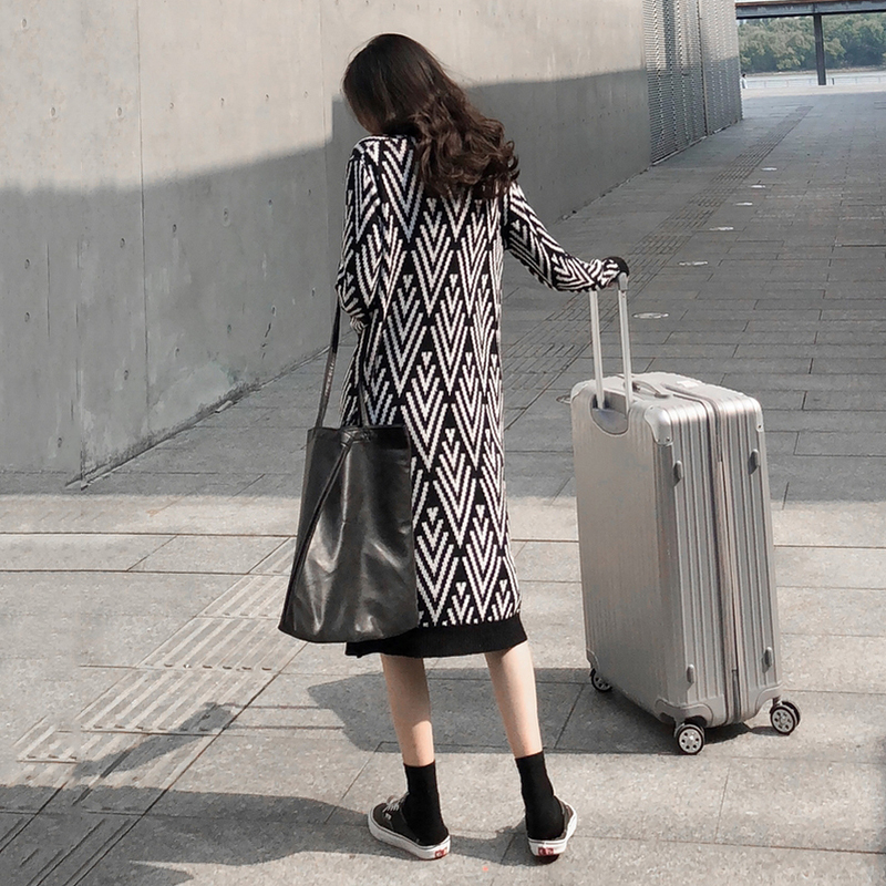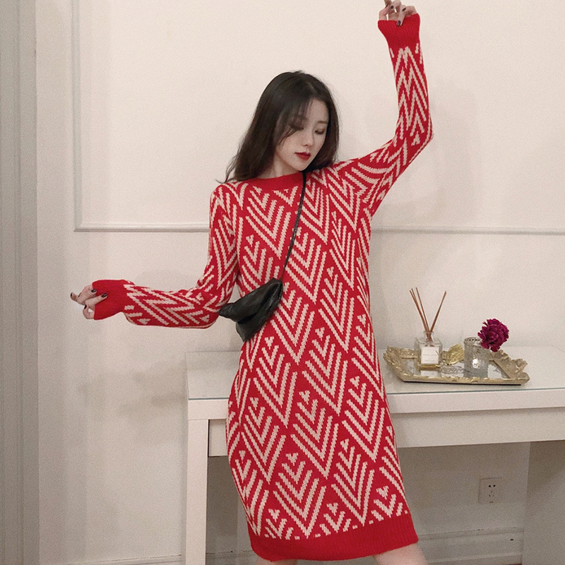 港味chic復古菱形針織毛衣裙女冬裝2018新款中長款寬松長袖連衣裙