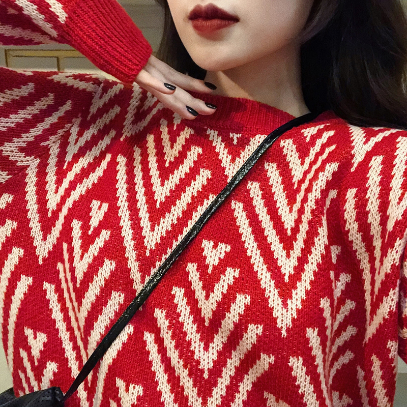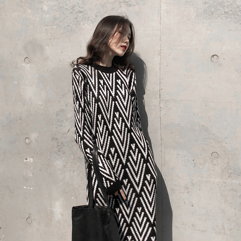 / 港味chic復古菱形針織毛衣裙女冬裝2018新款中長款寬松長袖連衣裙