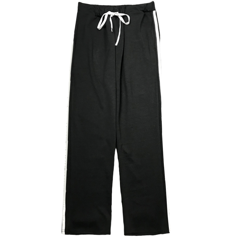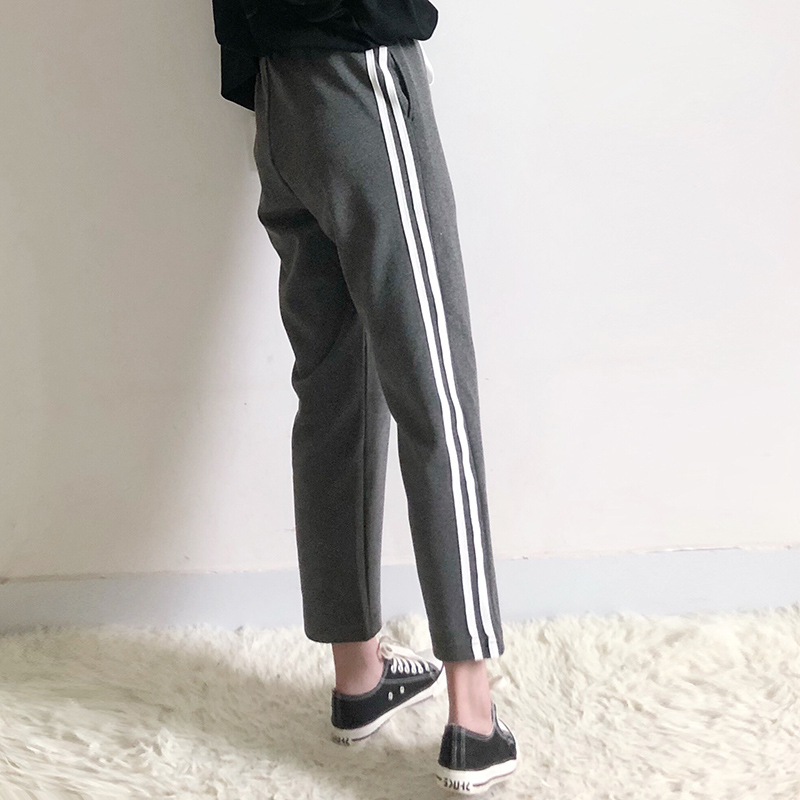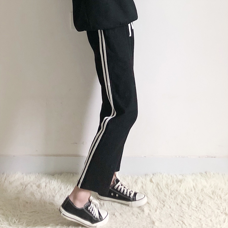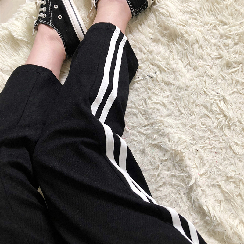 / 休閑運動褲女秋裝新款寬松兩條杠學生褲子韓版高腰綁帶休閑直筒褲