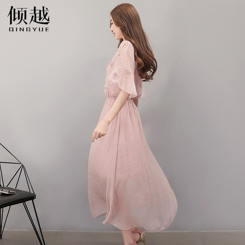 2017夏季新款韓版雪紡連衣裙女中長款短袖沙灘裙修身顯瘦裙子長裙