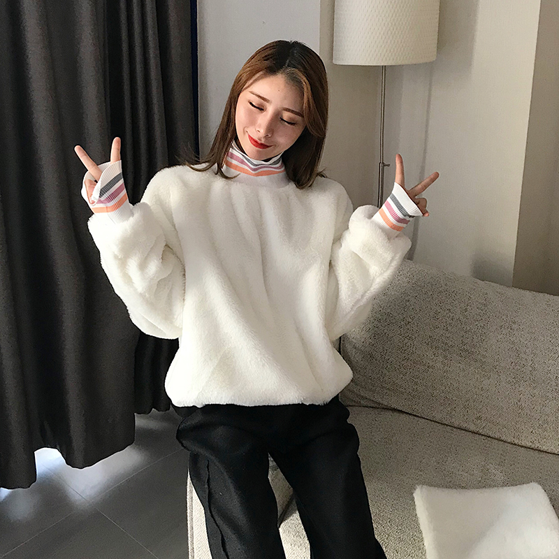 / 秋冬新款韓版時尚高領長袖條紋加絨加厚保暖上衣寬松女裝chic衛衣