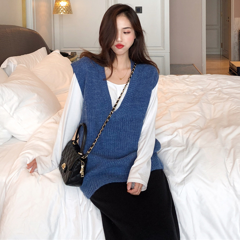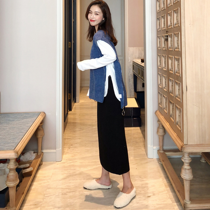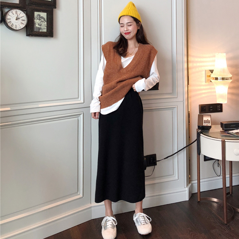 御姐套裝女秋冬新款V領寬松馬甲針織衫外套高腰顯瘦黑色半身裙子