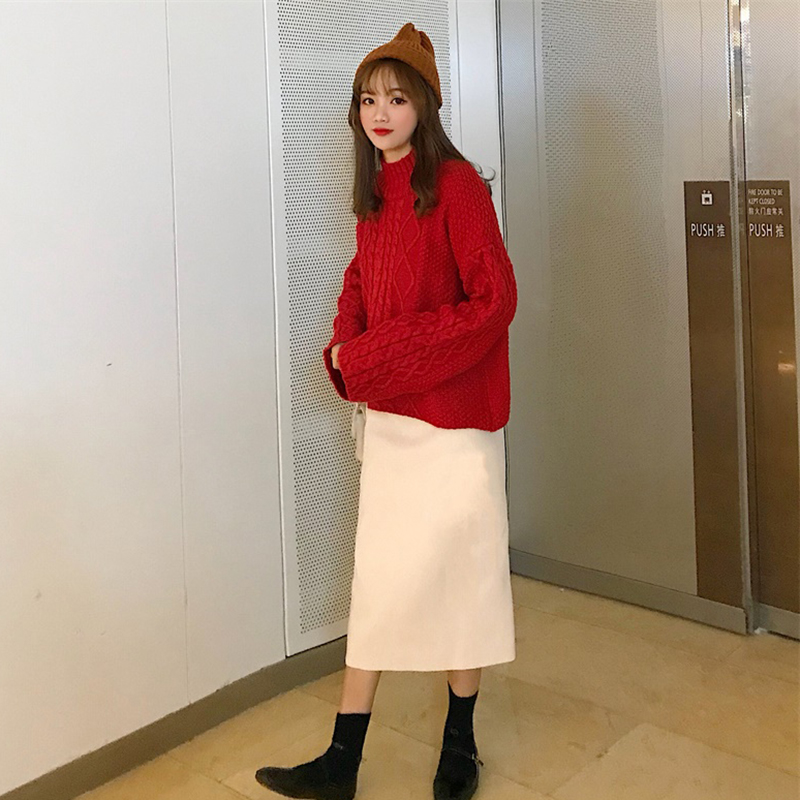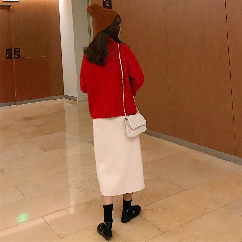 紅色毛衣|杏色毛衣|豆綠半身裙|杏色半身裙