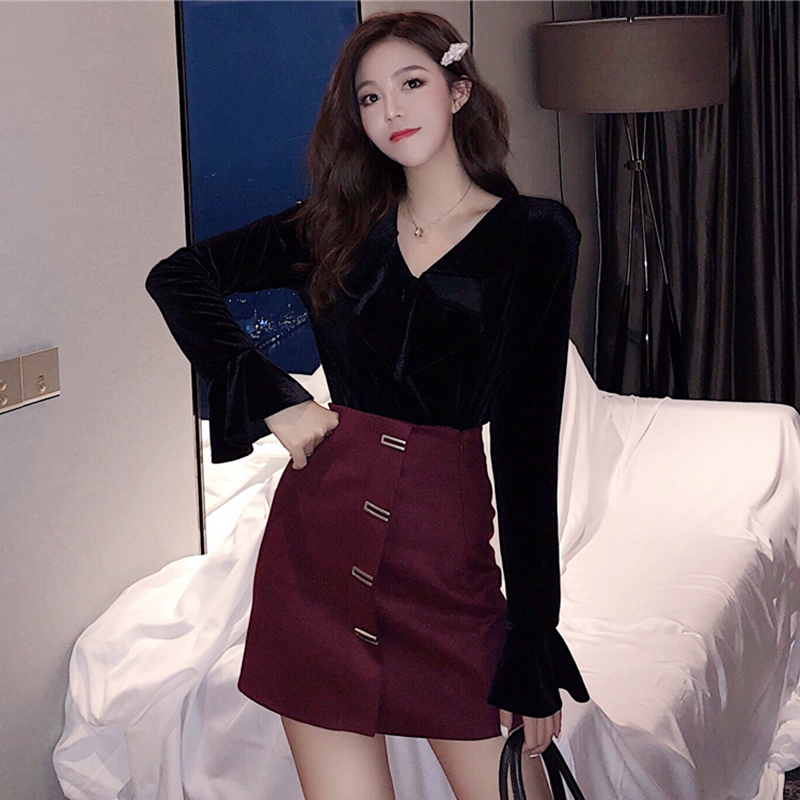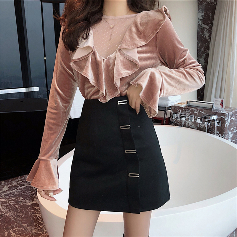 / 御姐套裝女秋冬新款網紗拼接絲絨修身打底衫高腰顯瘦A字半身裙子