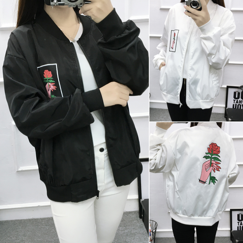 / 2017春季韓版原宿風花朵印花棒球服bf寬松夾克情侶長袖外套男女潮