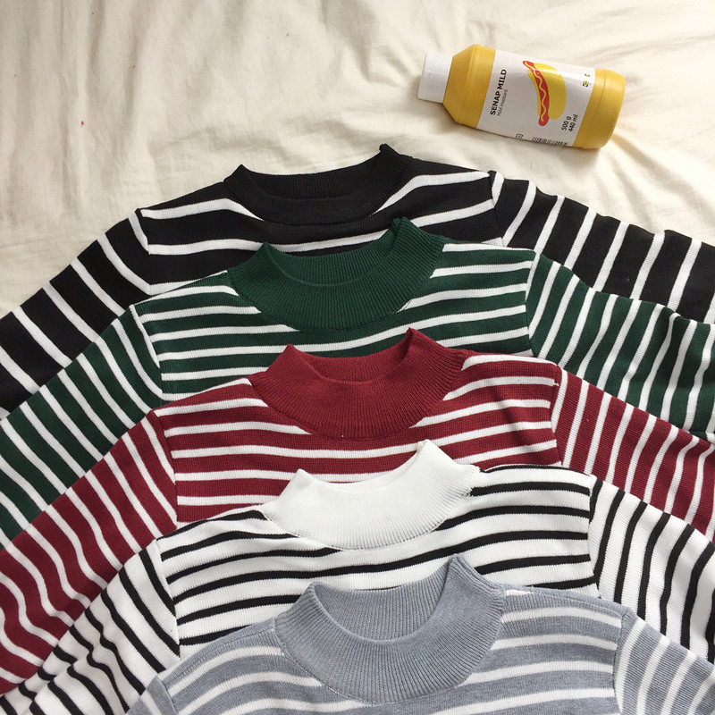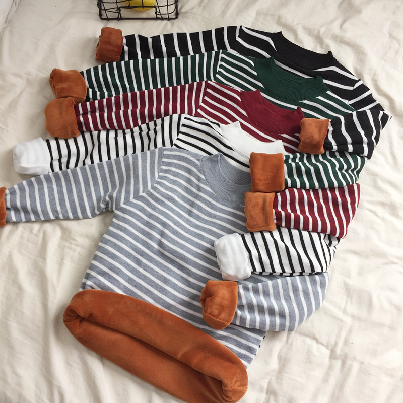 女冬裝2018新款韓版氣質修身加絨條紋針織衫學生百搭長袖打底毛衣