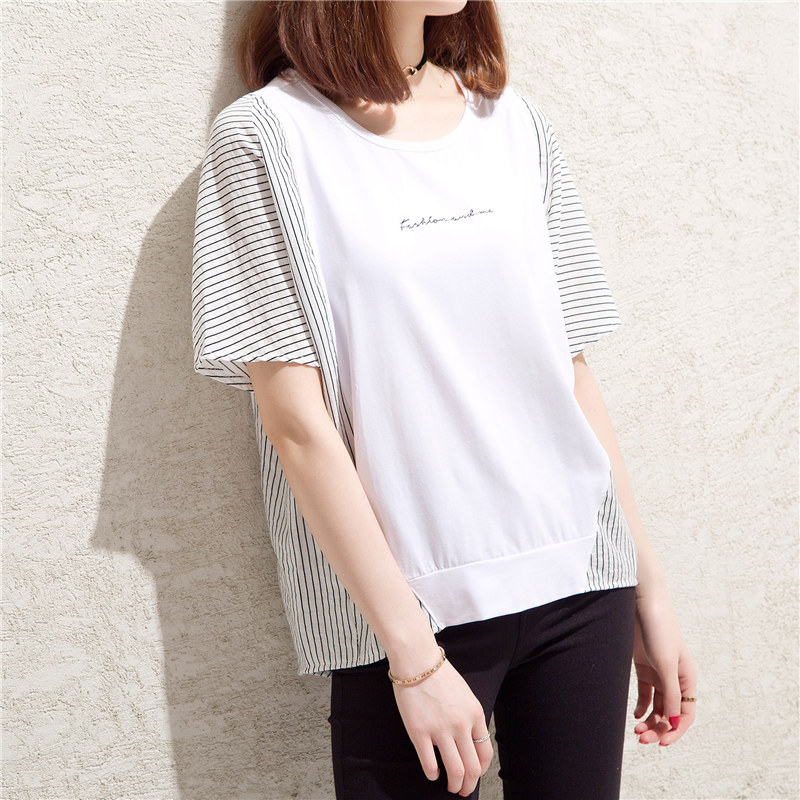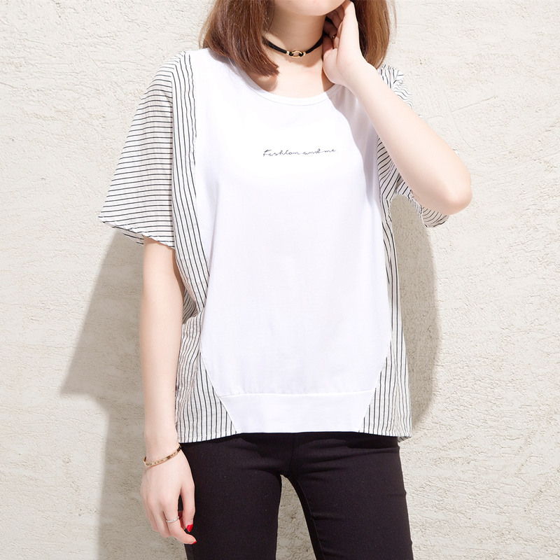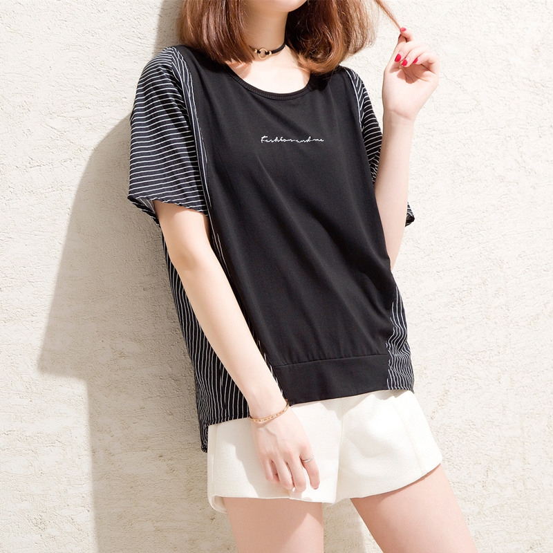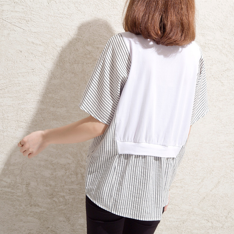 / 條紋t恤女小心機上衣大碼拼接寬松bf風體恤衫短袖女夏裝新款