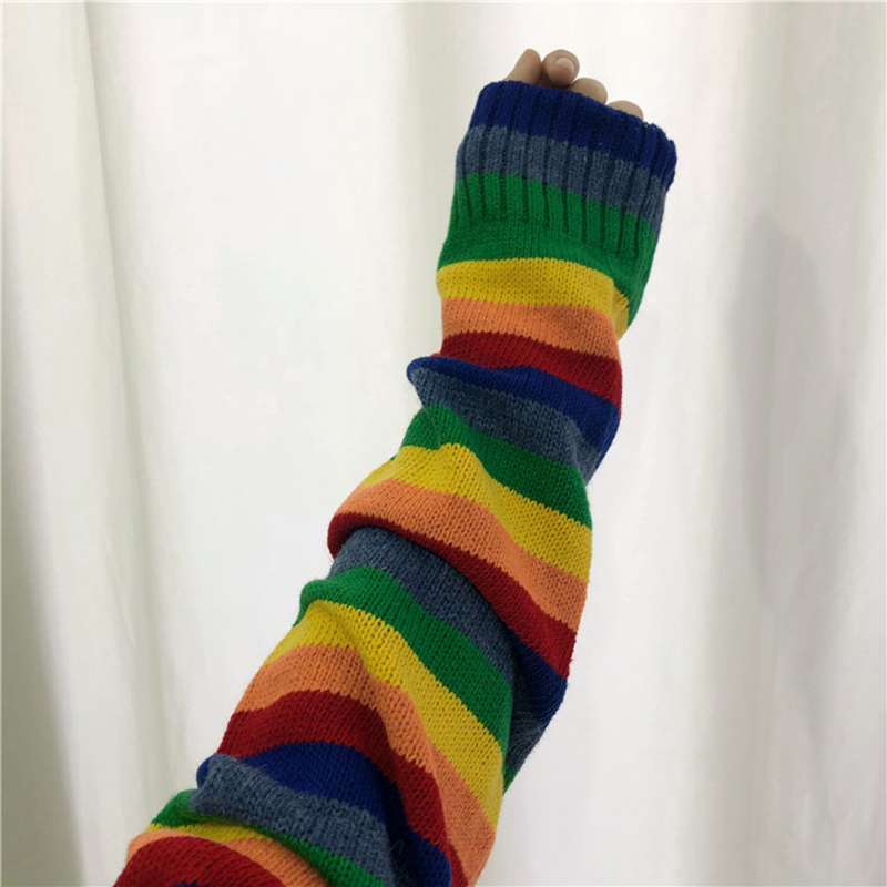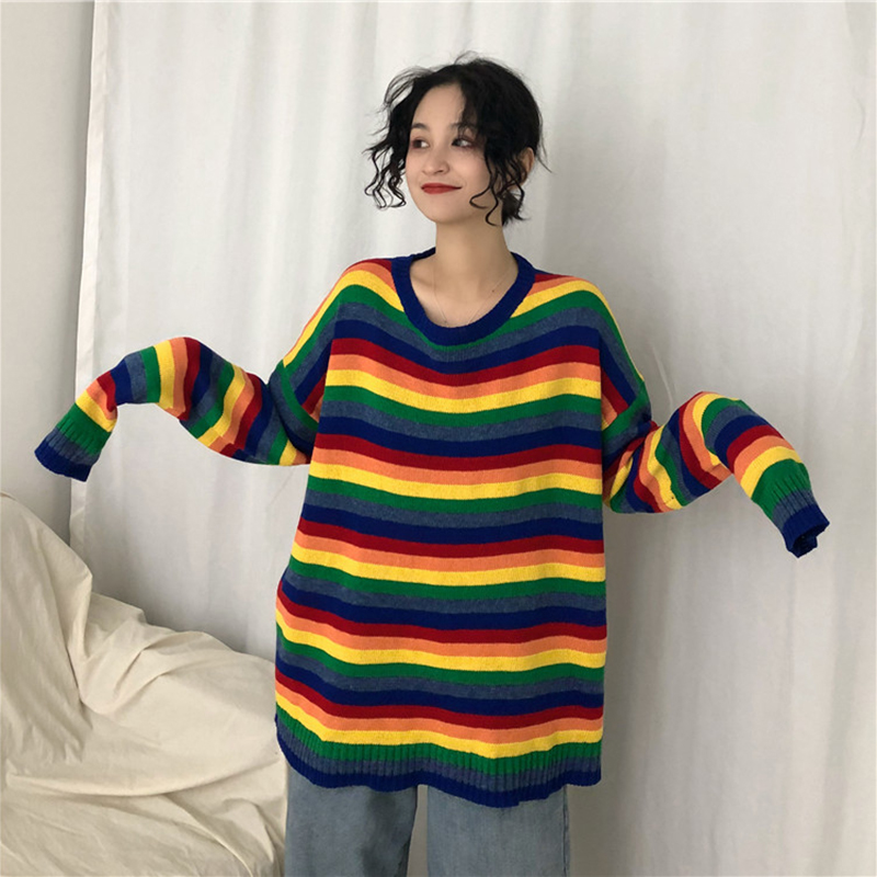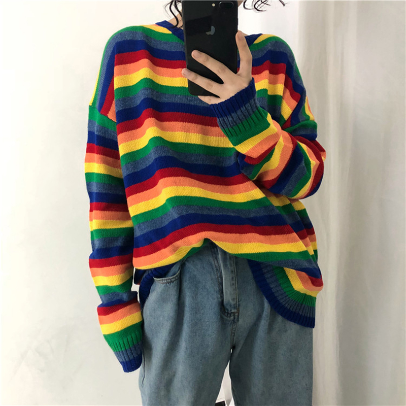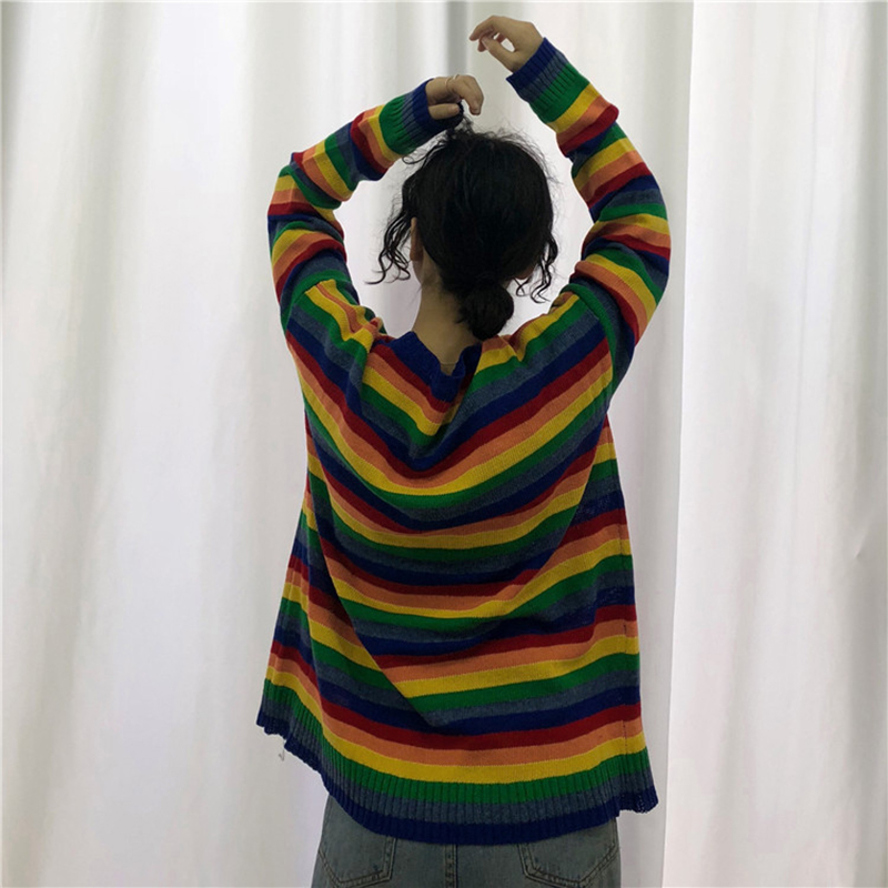 慵懶風彩虹條紋針織衫女秋冬裝2018新款韓版學生寬松套頭毛衣外套